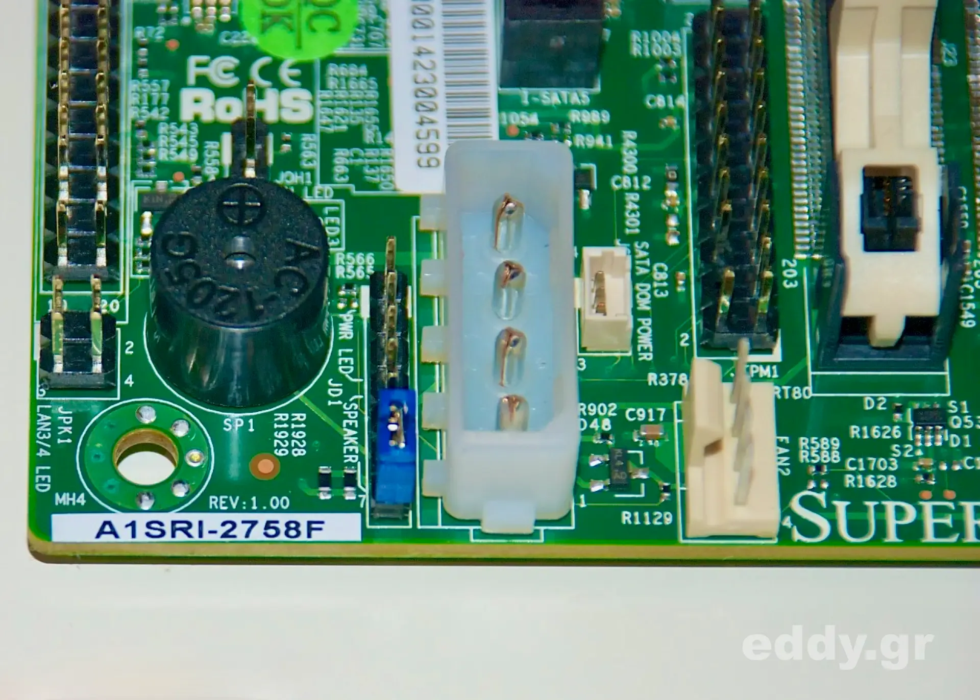 Der Rest ist eigentlich mit Ruhe und Überlegtheit gut zu bewältigen. Das Board nimmt wirklich nur gleiche Speichermodule. In diesem Punkt behält das Manual von Supermicro tatsächlich Recht. Testweise habe ich mal Kingston ECC-Module 2*8GB mit 2*4GB gemischt und da ging gar nichts Die dem Motherbaord beiliegende ATX-Blende wird nicht benötigt, da das hier gezeigte Chassis und das Board nicht von ungefähr gut zueinander passen. Vom Netzteil wird einfach nur JPW1* mit seinen 24 Pins gesteckt, der J1* 4-pin 12V DC Power Connector auf dem Board bleibt frei.