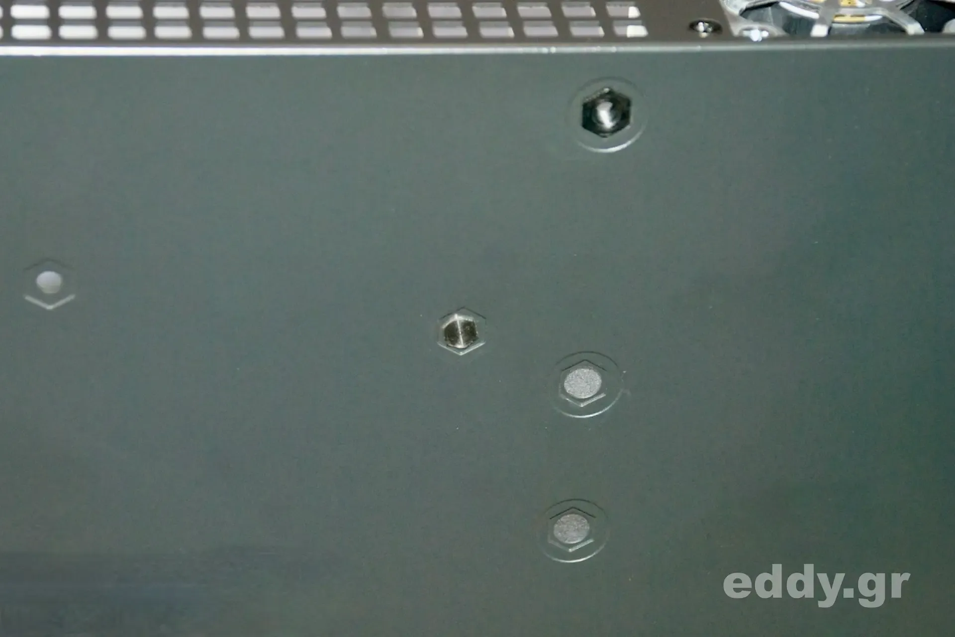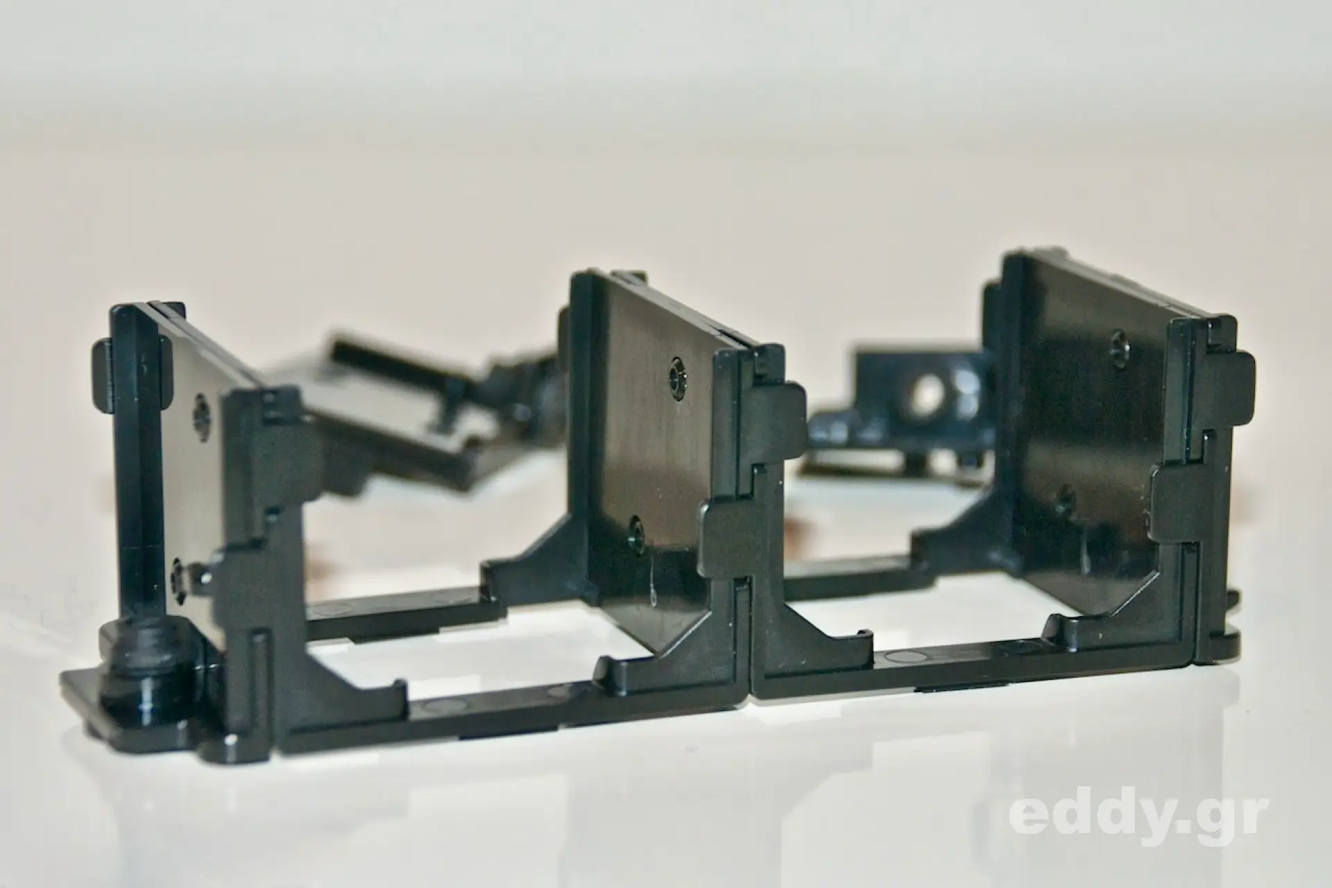 Die den Haltern heiligenden Metallstiftchen werden an den Positionen der Lüfterhalterarretierung von unten durchs Chassis geschraubt, das restliche Plastik- und Gummizeugs kommt entsprechend der Bilder an die kleinen Ventilatoren, welche hiernach einfach von oben inn rechteckige Mittelfeld der Lüfterhalter gelegt werden. Die Lüfter saugen übrigens von hinten und pusten nach vorn.