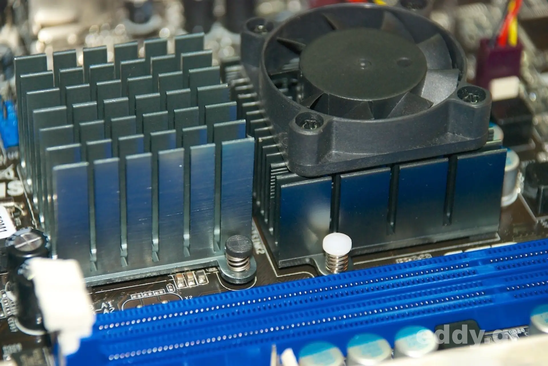 Vorweg stecken wir die RAM-Riegel auf das Motherboard. Dann blicken wir von oben auf das leere CI-70. Die Front zeigt zu uns und das Rückteil von uns weg. Die Kabel der Anschlussplatine legen wir links aus dem Gehäuse heraus, damit sie beim Einsetzen des Motherboards nicht stören. Mit der linken Hand drückt man vom Gehäuseinneren das Slotblech an die Aussparung und mit der rechten Hand, am Motherboard-Lüfter gegriffen, bugsiert man das ASRock Motherboard vorsichtig und langsam über die 4 Schraubsockel für die Schraublöcher am Motherboard und drückt es zugleich gegen das Slotblech. Nun mit einer Hand fixieren und mit der anderen Hand die 4 Motherboard-Schrauben festdrehen.