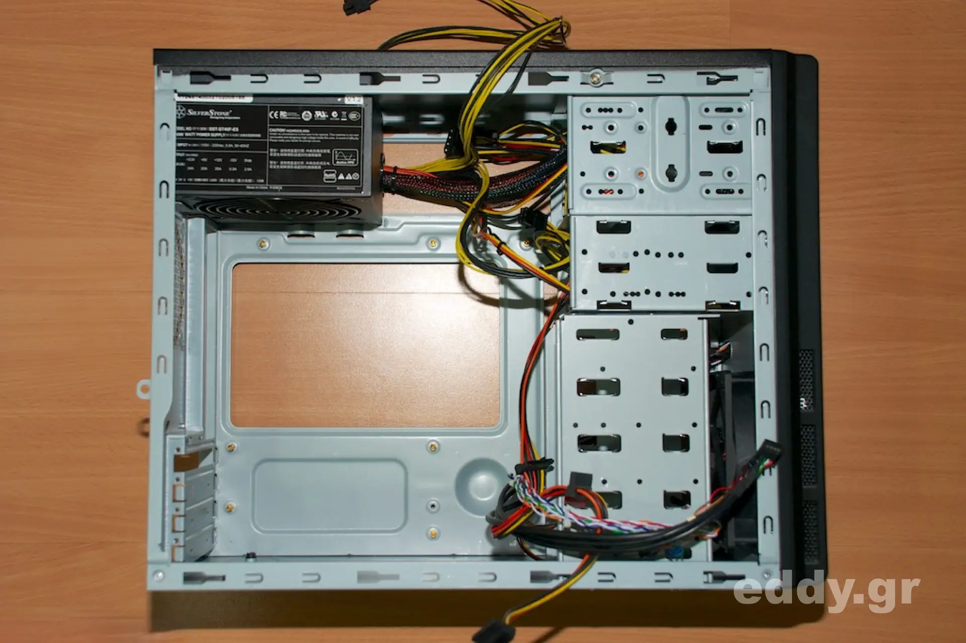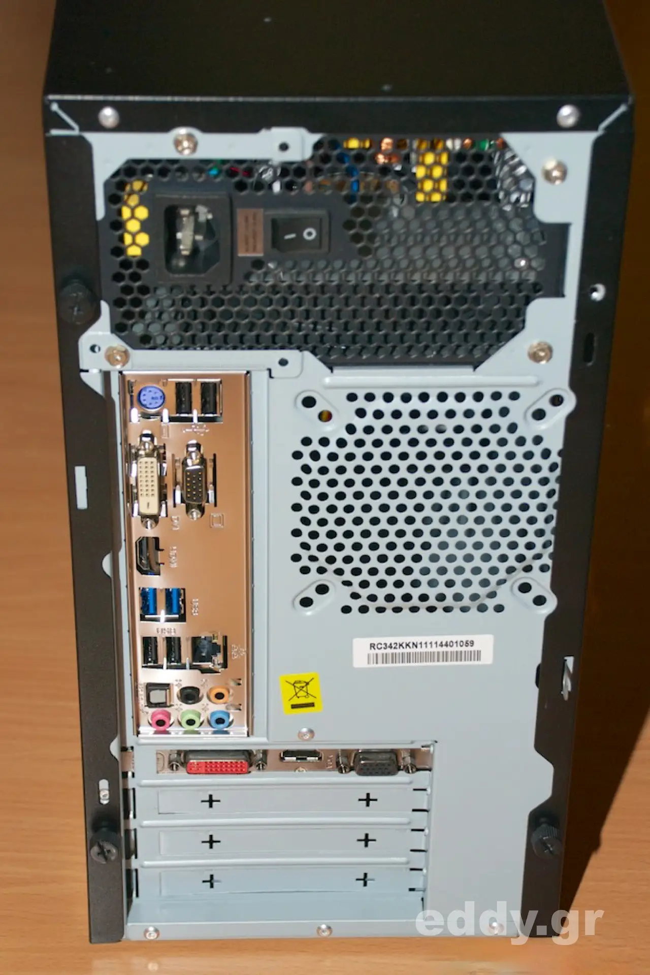 Wie schon gesagt, dürfte die mir persönlich bekannte Alt-PC-geschädigte Person mit dem ASRock als Basis glücklich werden. Je nach Einsatzzweck und je später zur Verfügung stehendem Etat lassen sich hier der Arbeitsspeicher auf 16 oder 32 GB erhöhen, große SSDs, Festplatten oder Hybriden hinzunehmen und der Celeron kann einem Core i5 oder Core i7 weichen. Übrigens gibt es auf eBay immer wieder preislich interessante gebrauchte Ivy-Bridge Chips von Haswell-Umsteigern. Auf dem Foto mit der Rückseite des PC ist das Slotblech der passiven PCI-E Grafikkarte XFX HD6450 zu erkennen, mit welcher man für unter 40 EUR schon deutlich mehr Grafikperformance haben kann. Wenn sowas rumliegt, dann rein damit …