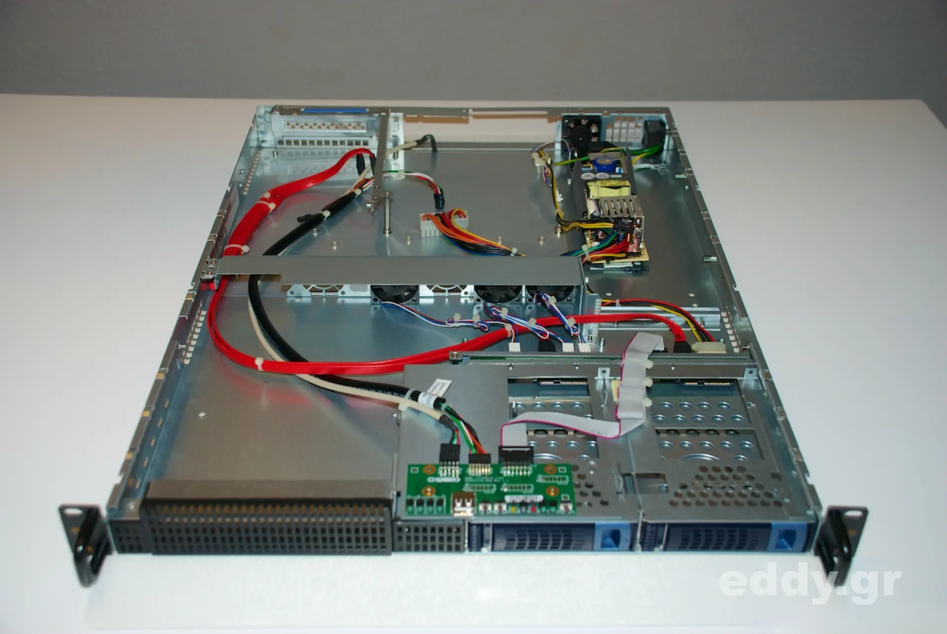 Zurück zu den tapferen Gebrauchtgehäusen. Achtet unbedingt darauf, dass Ihr das Teil mit vorhandener SATA-Backplane ersteht (wie auf den Fotos abgebildet). Je nach gedachten Einsatzzweck nimmt man eine SSD oder 2 Festplatten ins System und los geht’s. Ohne ECC wäre hier ein lokaler Gameserver denkbar oder in der SSD-Variante auch ein abgesetzter Webserver mit schnellen Reaktionszeiten. Die Abwesenheit von ECC und RAID könnte man hier hinreichend mit Backup per rsync im Intranet kompensieren. Mit 2 ‘fetten’ Festplatten könnte die Combo auch wunderbar als DLNA Server und iTunes Server fungieren.