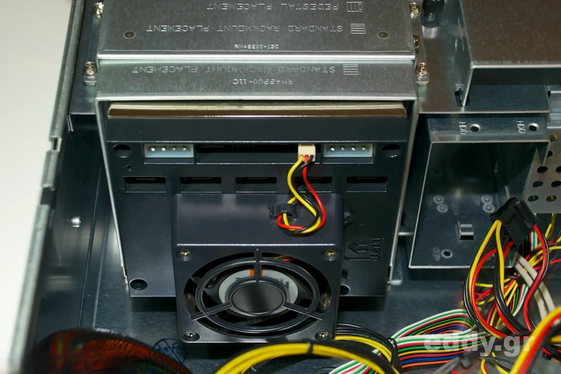 Standardmäßig lassen sich im Chenbro RM42200 fünf 3,5″-SATA-Festplatten unterbringen: (von vorn betrachtet) 2 links über dem klappbaren Ventilator, 2 rechts daneben hochkant und ein Laufwerk unter den drei externen 5,25″ Schächten. Natürlich ließen sich noch mit Abstandhaltern in den genannten drei großen Schächten 3 * 3,5″ Platten einlegen oder mit 3 Adaptern dann jeweils 2 * 2,5″ HDDs, aber das wäre frickelig. Zudem müsste man noch selbst für die Ventilation sorgen, vor allem aber wäre kein Platz mehr da fürs Chenbro SK33502.
