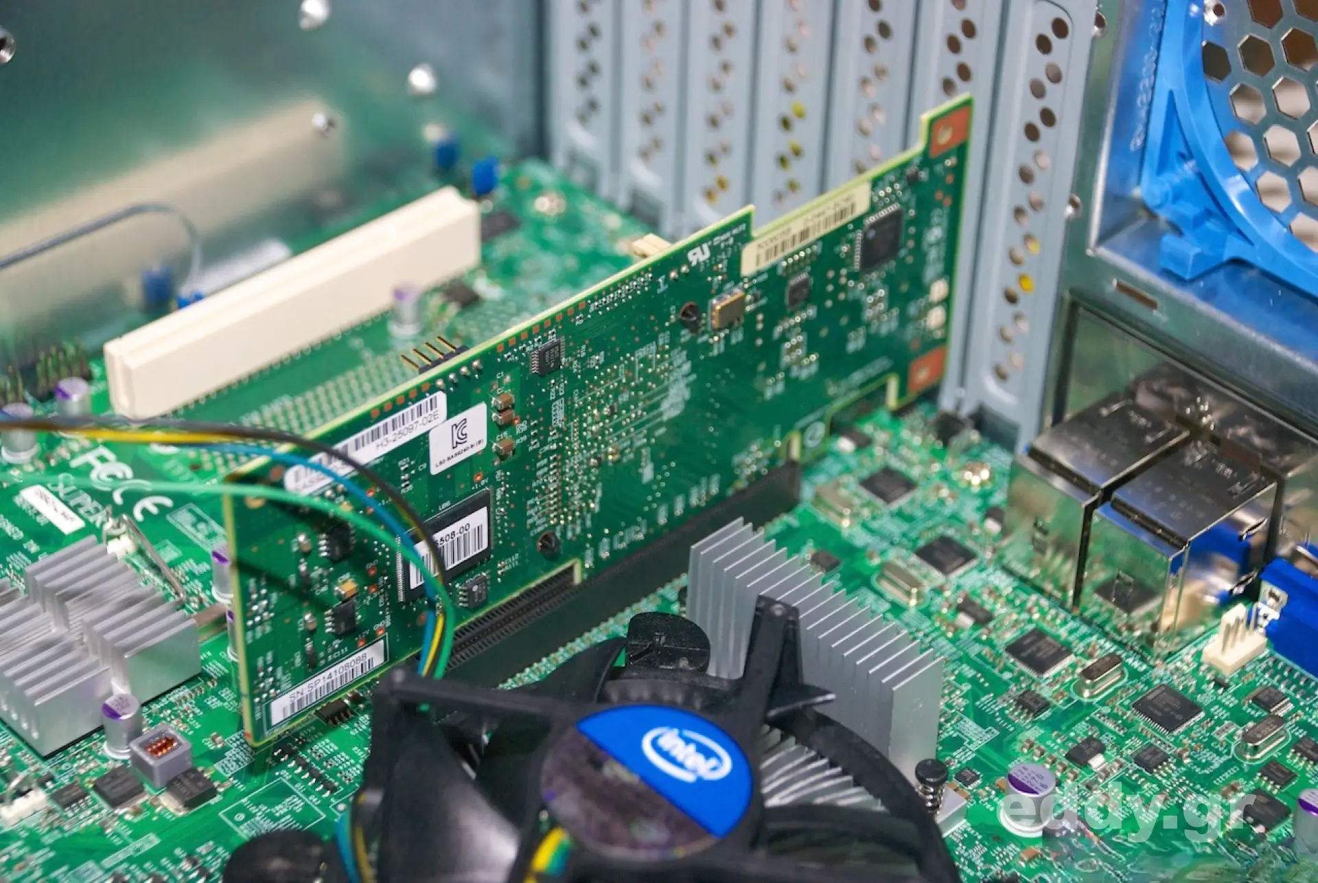 Zurück zum Thema: Im Server wollen möglichst viele Festplatten effizient ansprechbar sein. Im Revier kleiner Homeserver-Betreiber sind große Datenvolumen mit SAS-Platten nicht zu machen. Das wäre viel zu teuer. Man nimmt also große SATA-Platten, möglichst mit niedriger Internet-Unmutsquote, 24-Stunden-Freigabe und Herstellergarantie. Diese packt man in den Server und sorgt für Kühlung. Grundsätzlich können diese am Motherboard betrieben werden. ZFS bzw. Linux Software RAID handeln das ganz gut, doch bieten die meisten Motherboards nur knapp ein halbes Dutzend SATA-Ports. Will man sich also ein System mit mehreren Systemplatten und zusätzlich einem Datengrab von 8, 16 oder weiß-der-Kuckuck-wievielen HDDs aufbauen, dann muss ein RAID Controller her. Diese Erweiterungskarte, manchmal sind’s auch mehrere in einem System, stellt viele SAS/SATA Ports zur Verfügung und darüber hinaus entlastet der Controller die CPU (wenngleich das bei aktuellen Ivy Bridge XEONs auch nicht mehr so ins Gewicht fällt).