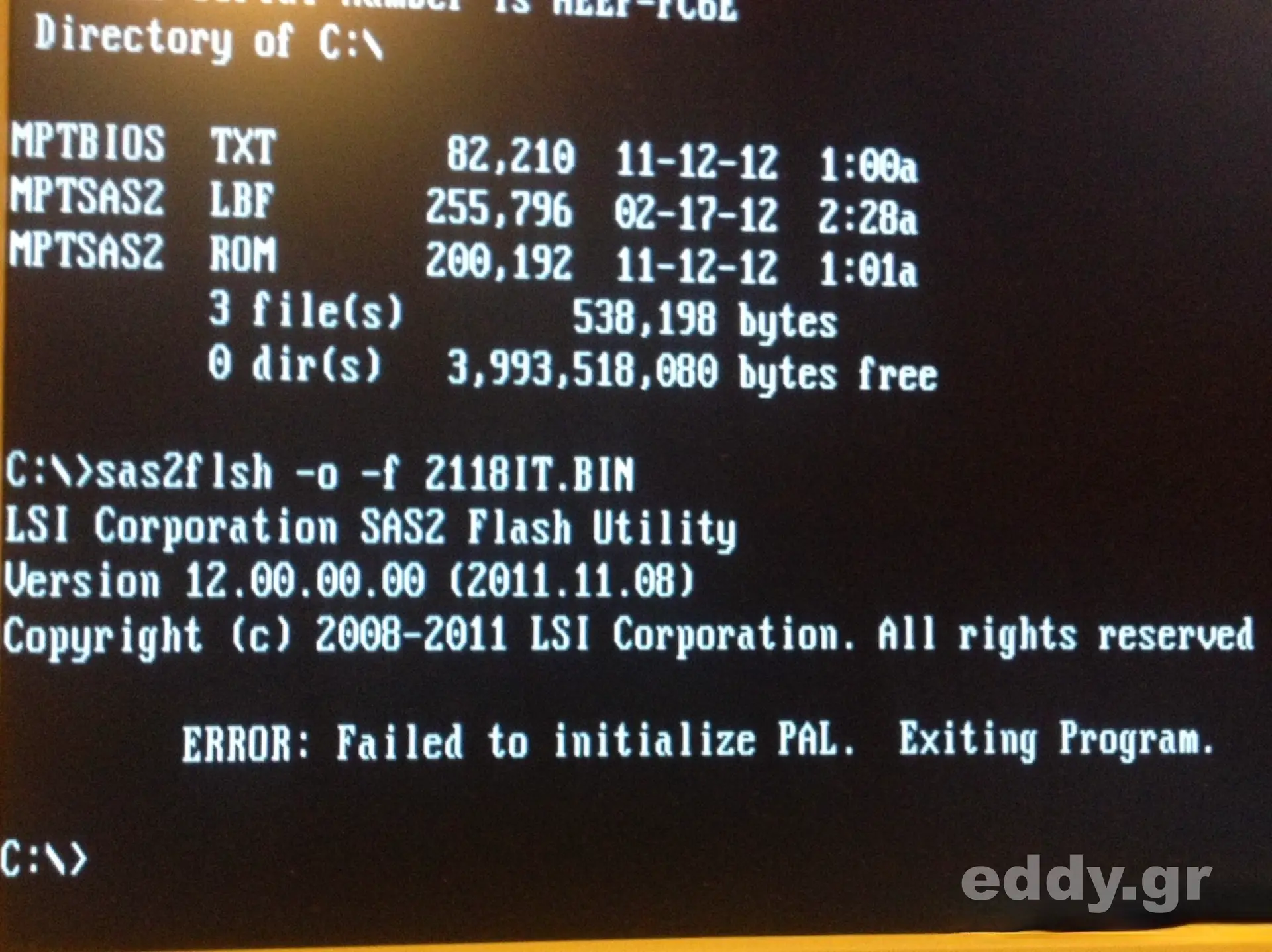 Wenn es bei Euch die Fehlermeldung ERROR: Failed to initialize PAL gibt, dann hilft das Durchprobieren verschiedener Motherboards. Nicht geklappt hat das Flashen in meinen Versuchen beim Supermicro X9SCI-LN4F und beim Gigabyte GA-Z77-DS3H. Funktionieren tat es beim Asrock 890GX Extreme4. Versuchen lässt sich das allgemein unter FreeBSD als auch in der UEFI-Shell.