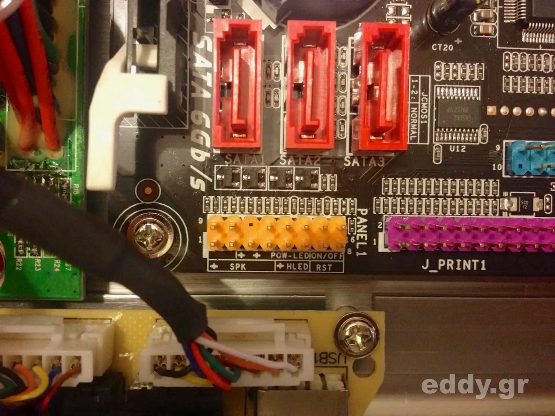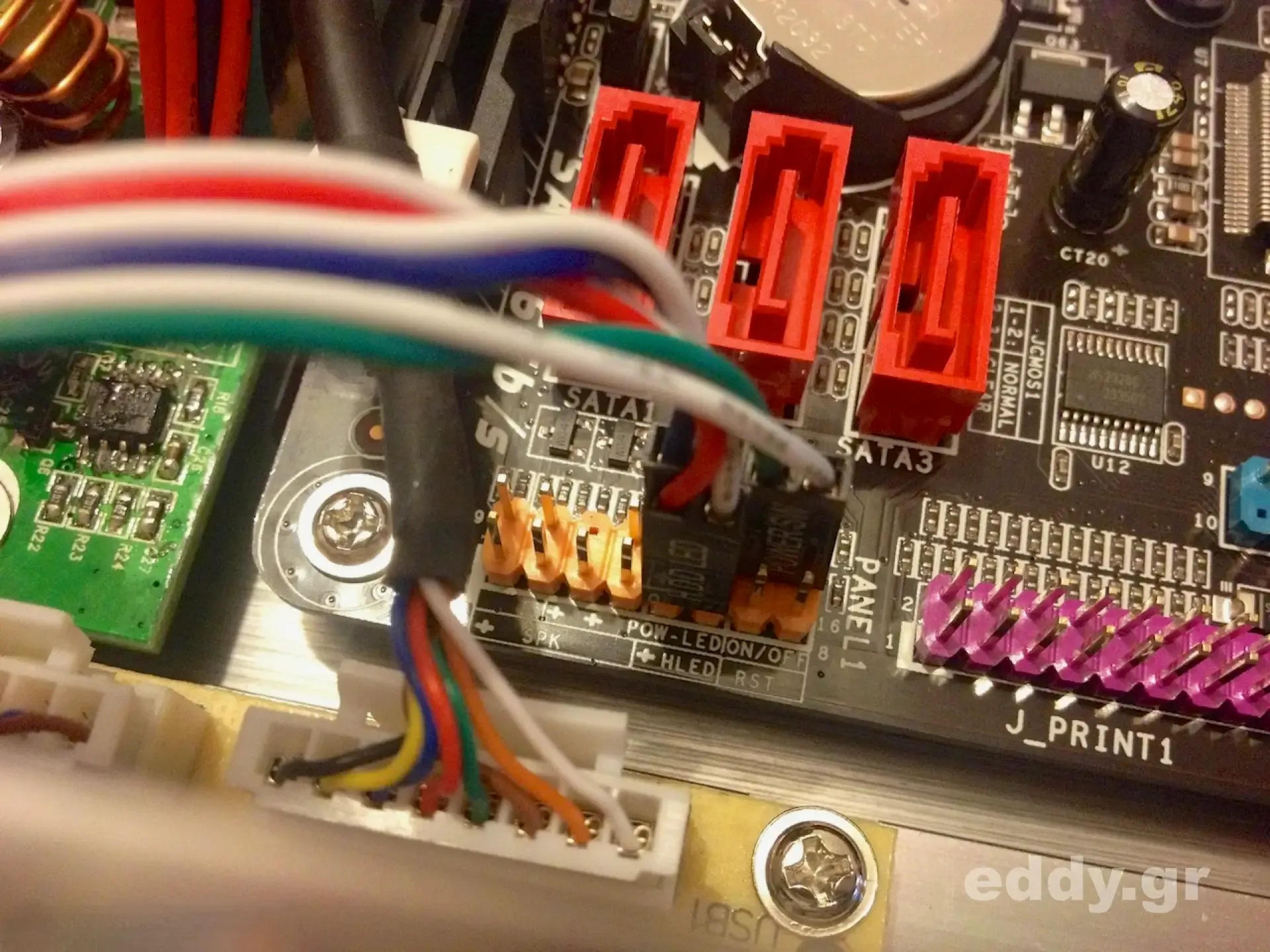 Jetzt können wir die zwei RAM-Riegel einsetzen. Als nächstes werden am Front Panel Connector des Motherboards die Käbelchen für den den On/Off Schalter und für die Power LED des Gehäuses gesteckt. Das weiße Käbelchen kommt jeweils auf Minus. Richtig ist es, wenn die Beschriftungen der kleinen Stecker zur Gehäusefront zeigen. Auf das Setzen der HDD-LED können wir verzichten und auf den Reset ebenso, weil die Reset-Funktion am CI-70 gar nicht vorhanden ist.