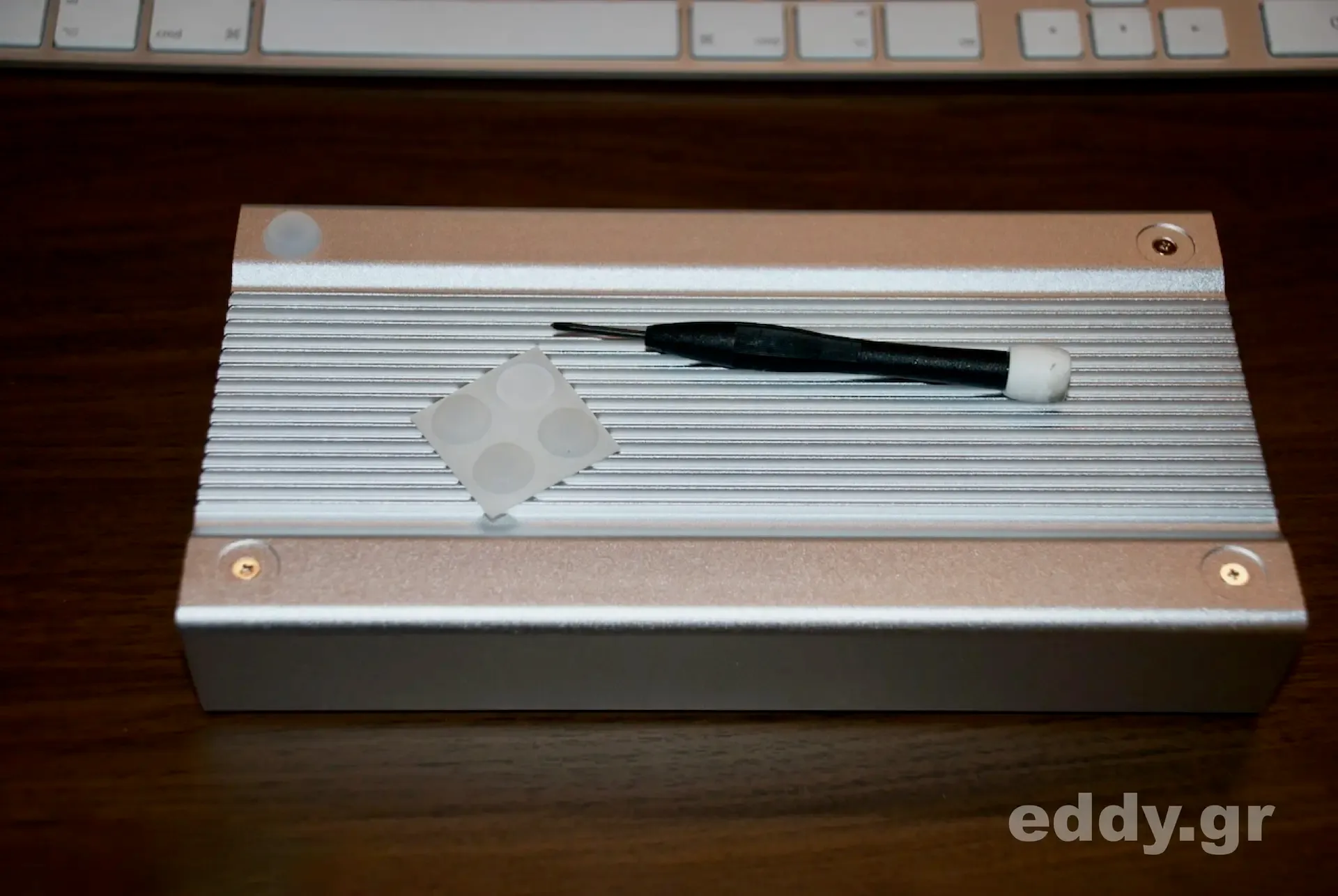 Mustergültig vollständig fällt der Lieferumfang und die herstellerseitige Vorbereitung des SK-3500 Super-S Combo aus. Alle Kabel sind enthalten und klugerweise ist im Neuzustand das Gehäuse nicht komplett verschraubt. Alles ist sehr passgenau und ich finde keine scharfen Kanten, was erfahrungsgemäß leider nicht selbstverständlich ist. Wir stecken das SATA-Stromkabel und das SATA-Datenkabel auf die SSD, setzen dann die SSD bäuchlings in den Einbauchschacht und mit der Buchsenseite in Rchtung der SATA-Stecker vom SK-3500. Nun werden an der Unterseite des SK-3500 die 4 passenden Schrauben an den tiefsten Bohrungen zum Halten der SSD verschraubt. Der Schlitten mit dem Innenleben wird nun von hinten wieder in das äußere Aluminiumgehäuse geschoben. Nun von unten das Gehäuse mit den 2 alten Schrauben und den 2 neuen aus dem Tütchen verschrauben und an die 4 Mulden werden die 4 Gummi-Füßchen geklebt. Das war’s schon.