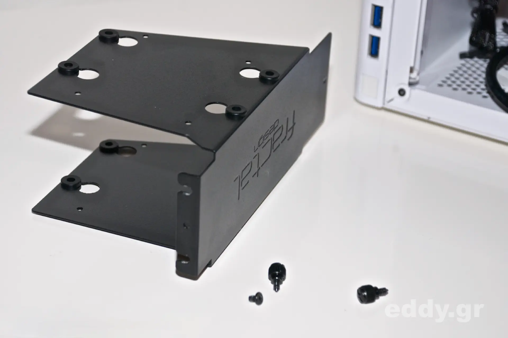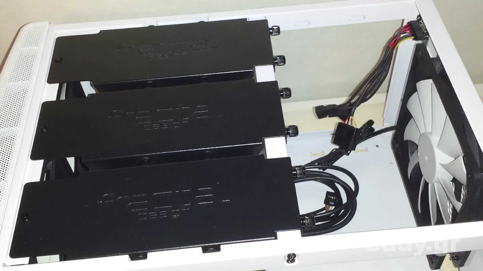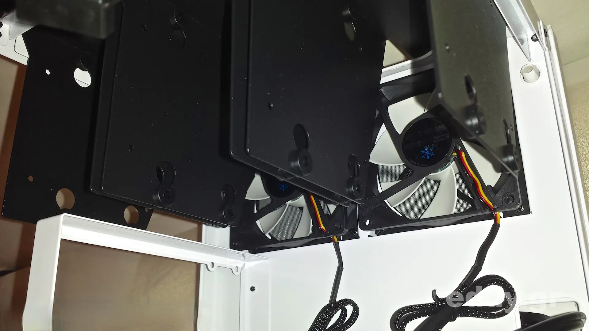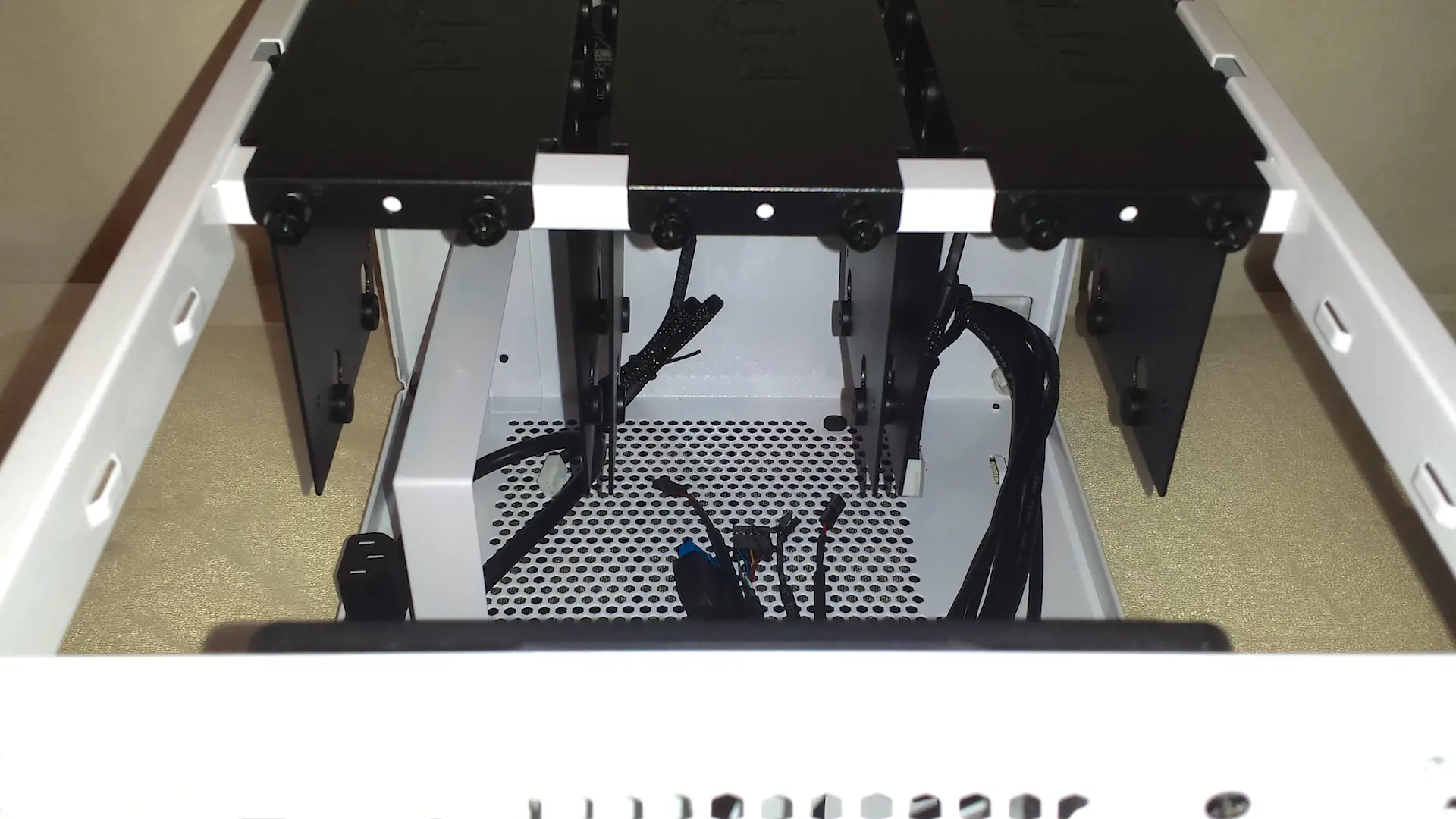 Mit vorgenanntem Übel sind die Sympathien für das Node 304 bei mir allmählich geschwunden. Als nächstes wandte sich mein Blick auf die Laufwerksträger. Alle Kreativität, um mit tradierten Konzepten zu brechen, welche teils die Intention vom Format Mini-ITX torpedieren, soll grundsätzlich willkommen sein. Nur sind die hängenden Träger im Fall des Node 304 so seine Sache. Es ist schon reichlich Arbeit, im Falle mehrerer bzw. vieler Laufwerke alle Träger mit jeweils 3 Schrauben zu entfernen und im Anschluss wieder zu montieren. Das hätte man doch bestimmt auch mit jeweils einer Schraube hinbekommen oder vielleicht mit einen Haltebügel für alle Träger? Leute, das sind hundermillionen unnötige Schrauberein … What the hell … Sei es drum. Lobenswert ist sicherlich, dass die Laufwerke allesamt gut von der zufließenden Luft der Frontlüfter bestrichen werden.