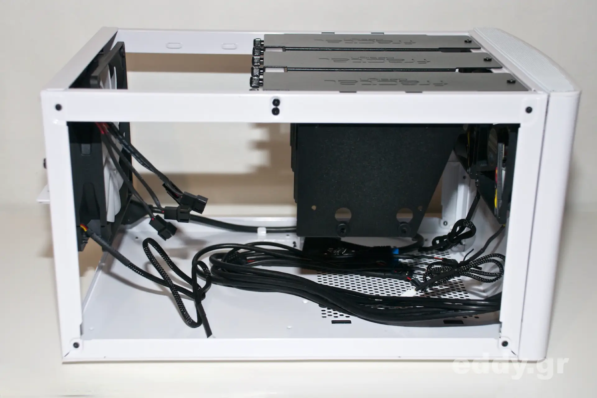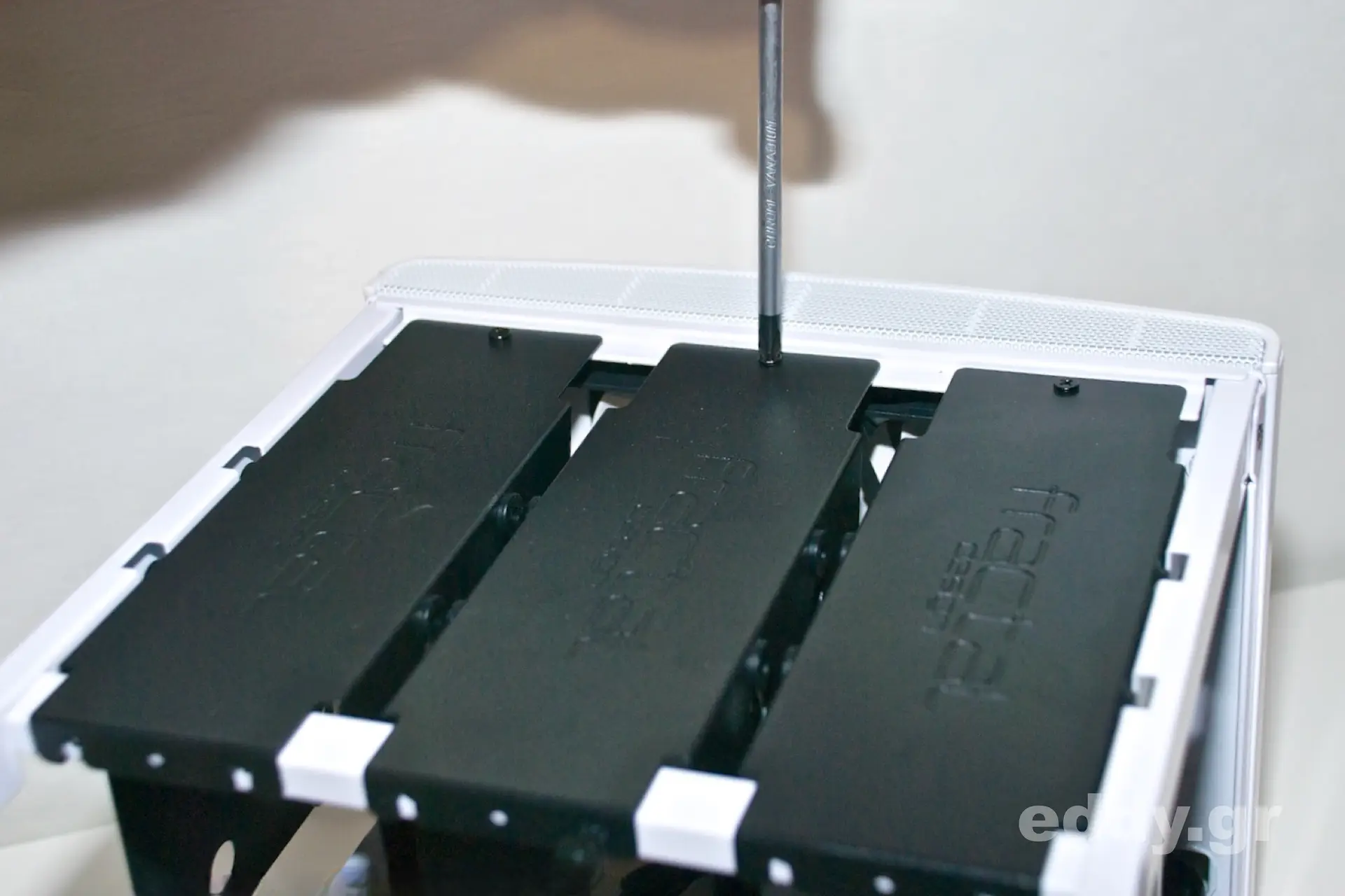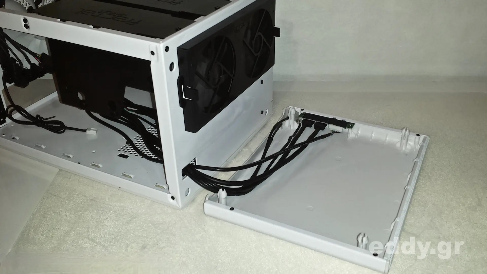 Das Node 304 ist es gut zerlegbar und der Gehäusedeckel kann problemlos abgenommen werden. Sogleich wird das Konzept der hängenden Laufwerksträger sichtbar, welche jeweils bis ein bis zwei Massenspeicher aufnehmen können.