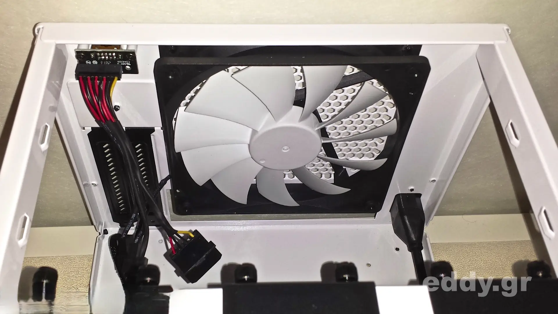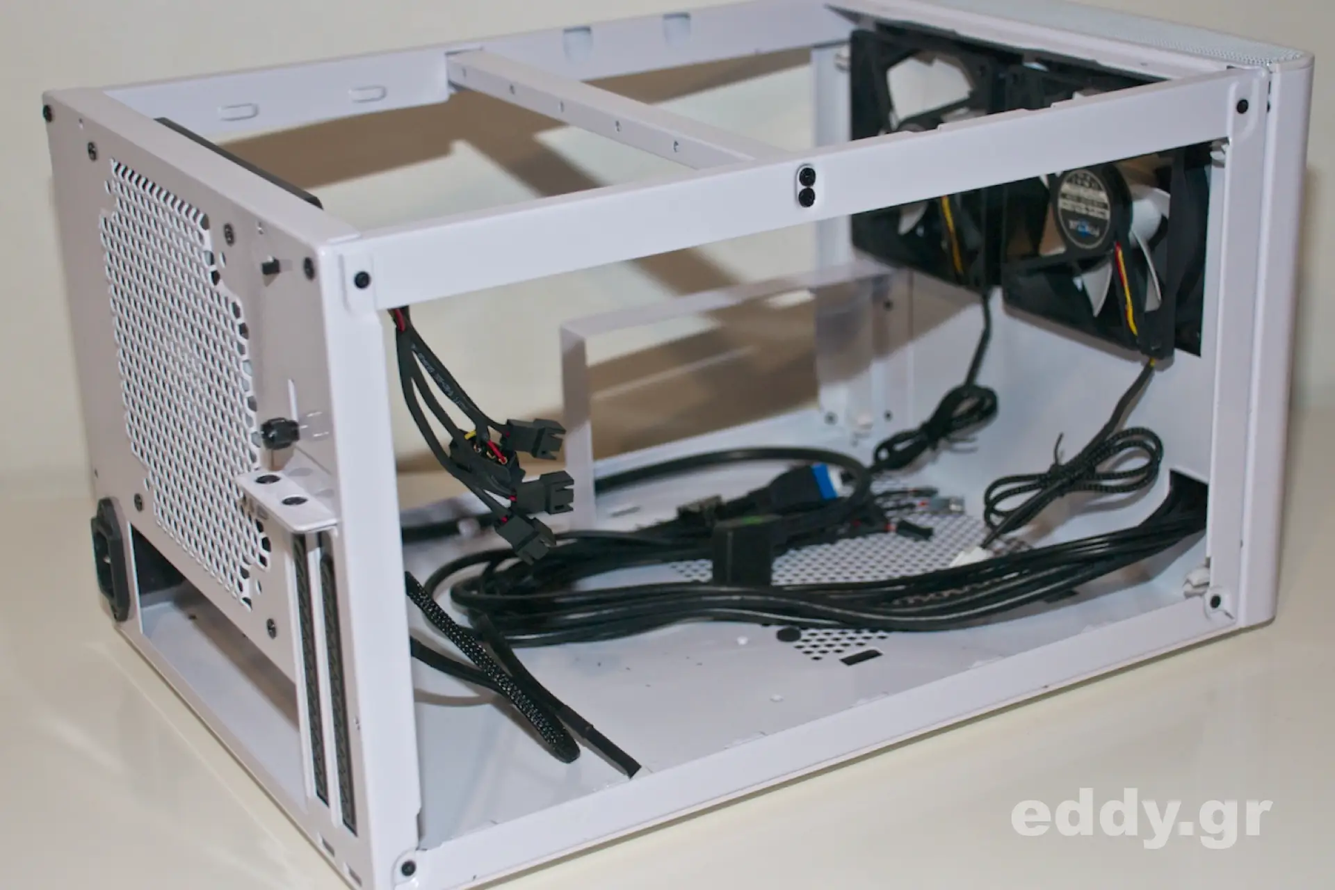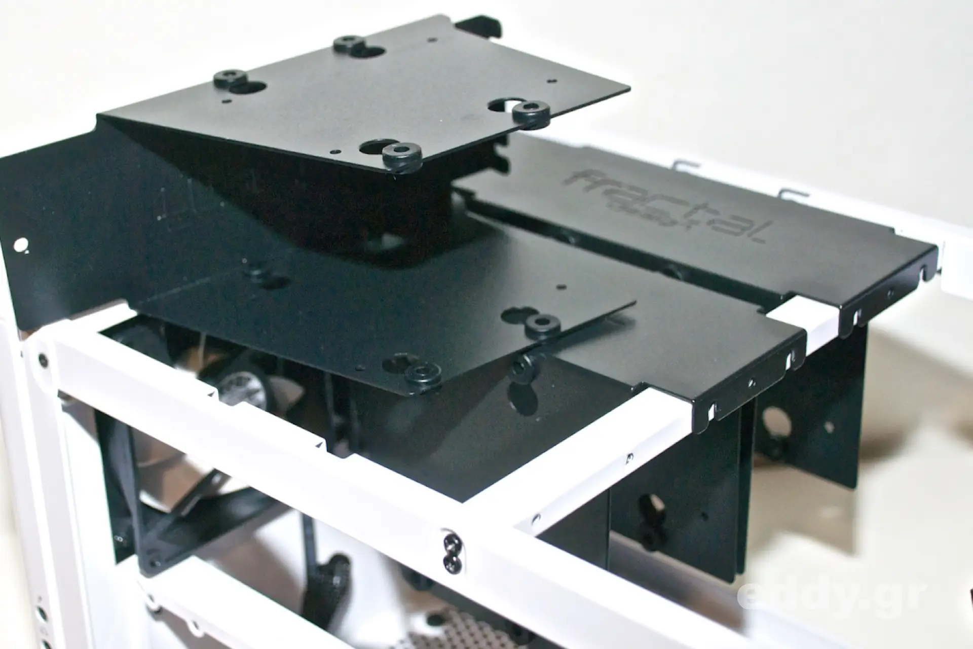Das Node 304 ist es gut zerlegbar und der Gehäusedeckel kann problemlos abgenommen werden. Sogleich wird das Konzept der hängenden Laufwerksträger sichtbar, welche jeweils bis ein bis zwei Massenspeicher aufnehmen können.