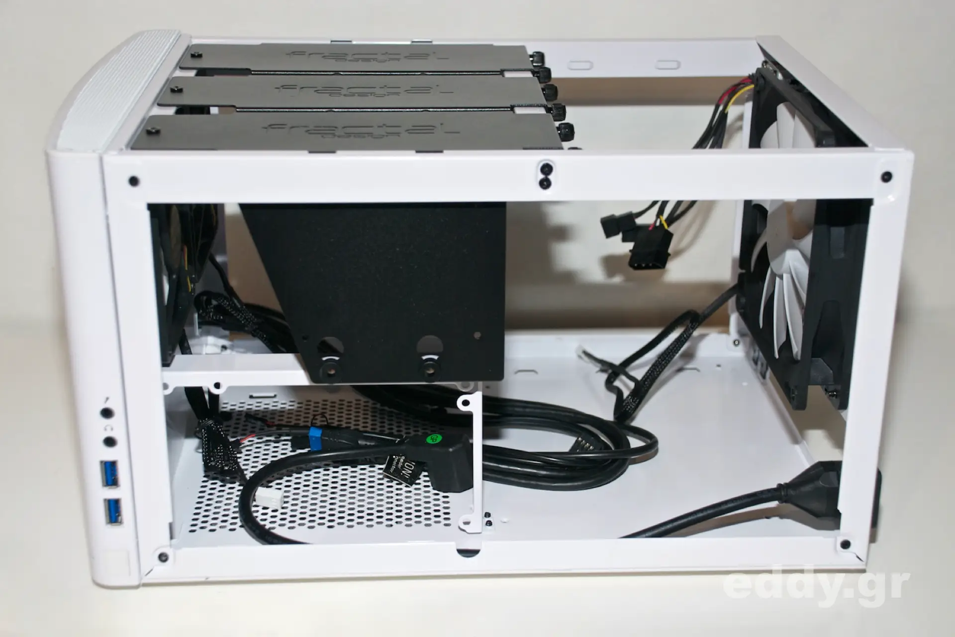 Dazu kommt noch, dass sich die Front des Node 304 nicht leicht lösen ließ, es braucht wieder mal im Idealfall drei bis vier Hände, damit man es mit wenig Bauchschmerzen und ohne Materialermüdung der Plastikarretierungen machen kann. Bedenkt man dabei, dass dieses fragile Lösen nicht nur einmal fällig wird, sondern zum Zwecke der Staubentfernung vom frontseitig integrierten Staubfilter immer wieder einmal, so kommt bei mir doch etwas Unmut auf. Warum nur müssen diese von mir verzweifelt als ‘Sollbruchplastik’ titulierten Dinger immer wieder eine Gehäusefront halten? Derart befestigte Fronten sind mir schon mehrfach aus dem Lieferkarton entgegengefallen, beim eigenen Transport sind sie auch schon gebrochen und beim Abnehmen der Fronten sowieso schon mehrfach. Es sollte ein Gesetz gegen diese Plastikhaken, -propfen und -lanzen geben, verflucht nochmal …