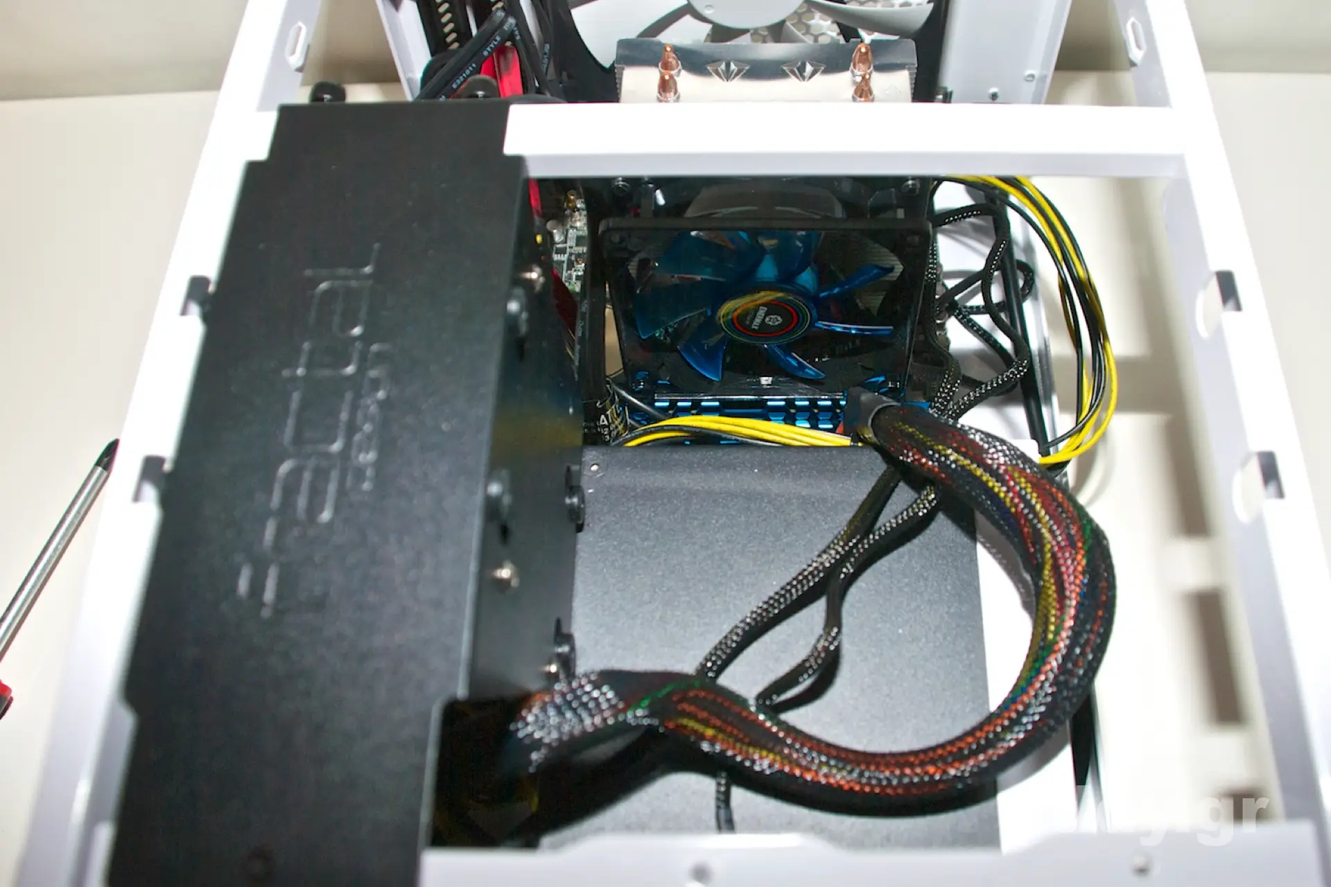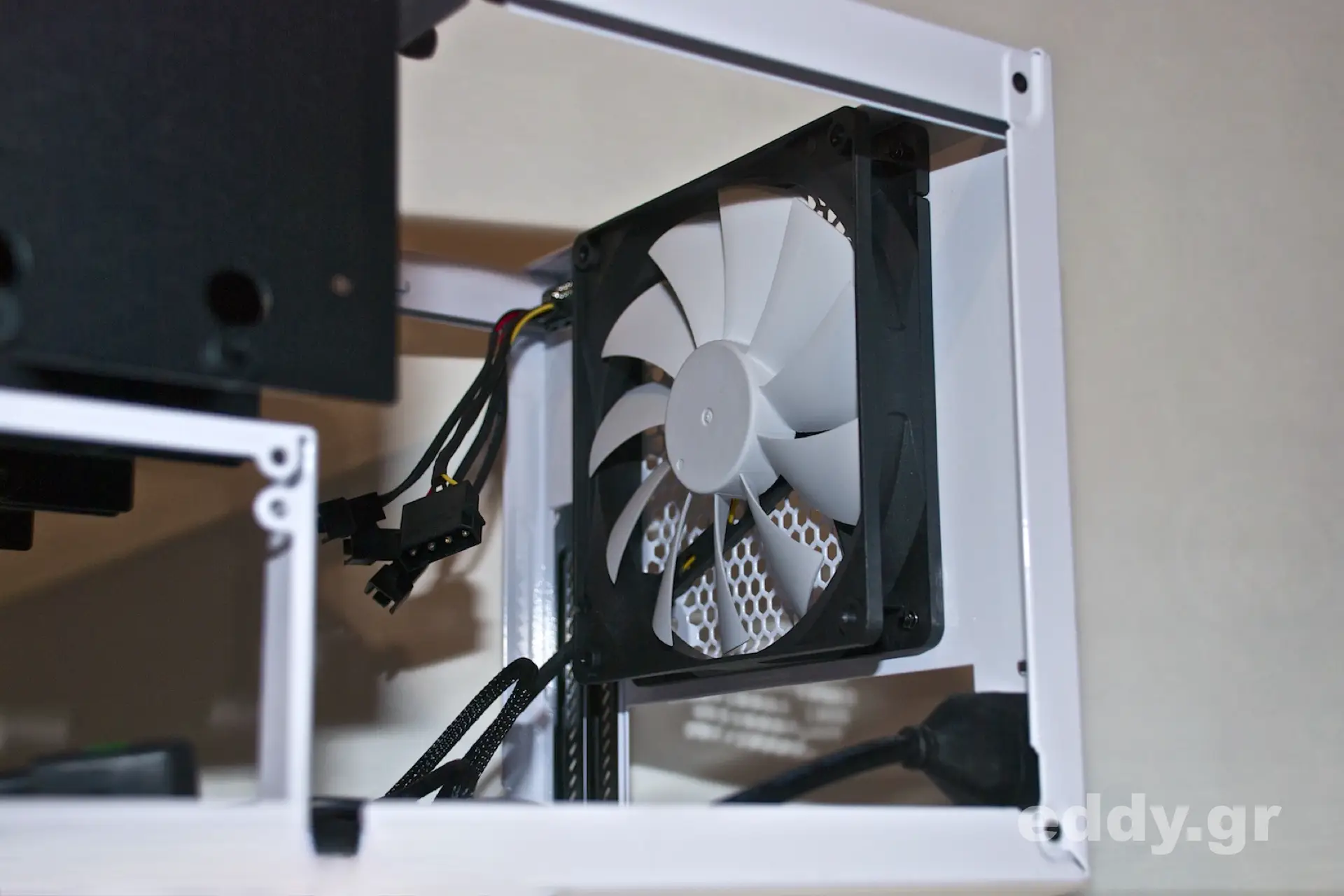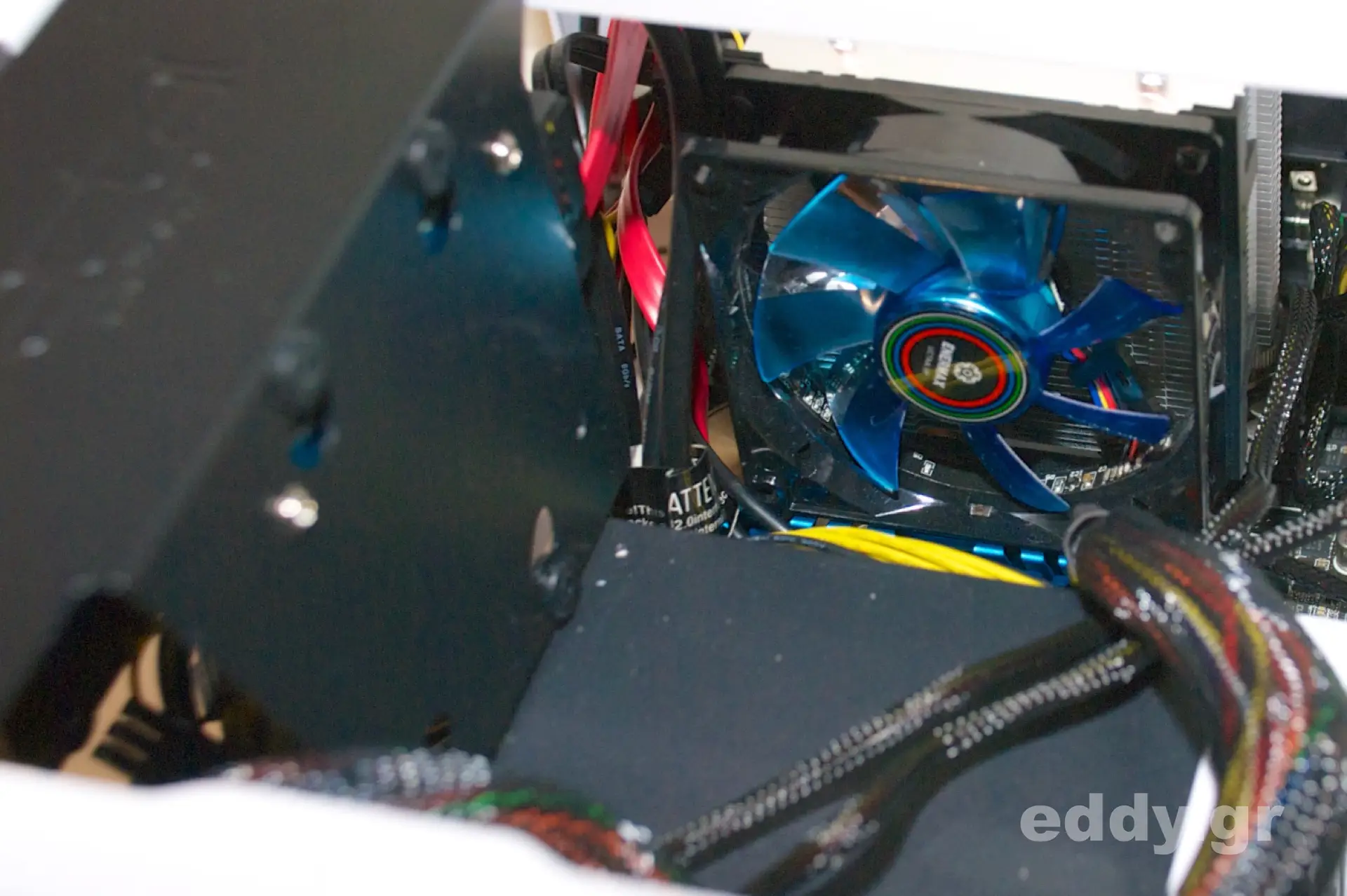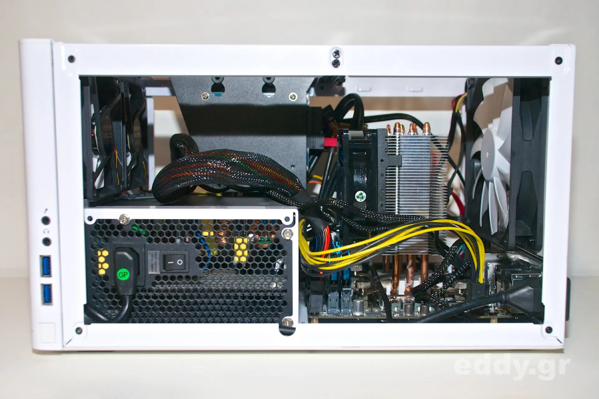Und man sieht es: mit den für ATX-Netzteilen üblichen Kabellängen kann es eng werden. Auch Kabelsalat kann eine begünstigende Luftzirkulation verhindern. Der Hersteller sieht übrigens vor, in dem Node 304 eine lange Grafikkarte verwenden zu können. Dass die von uns beschriebene Situation im Gehäuse dadurch nicht vereinfacht würde, dürfte auf der Hand liegen.