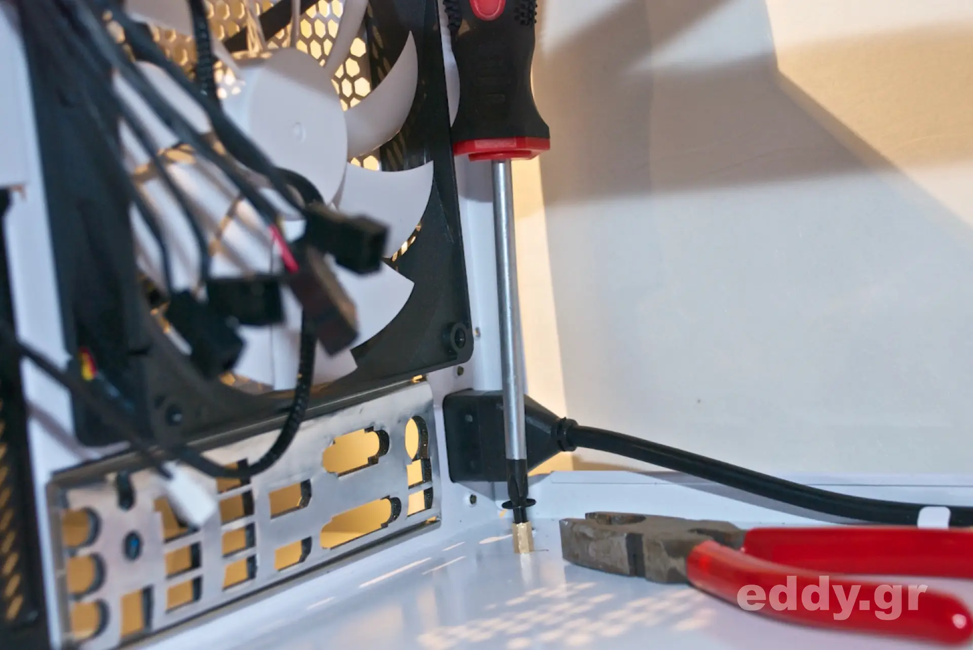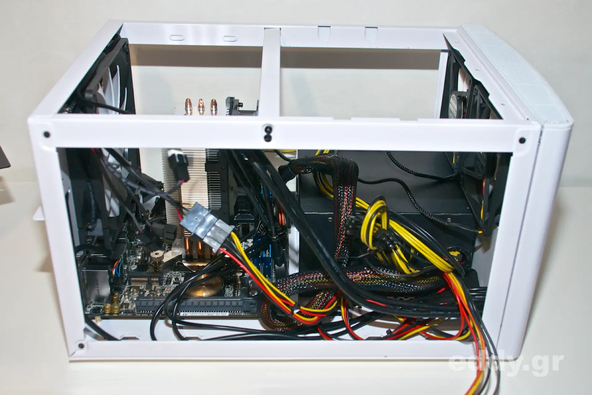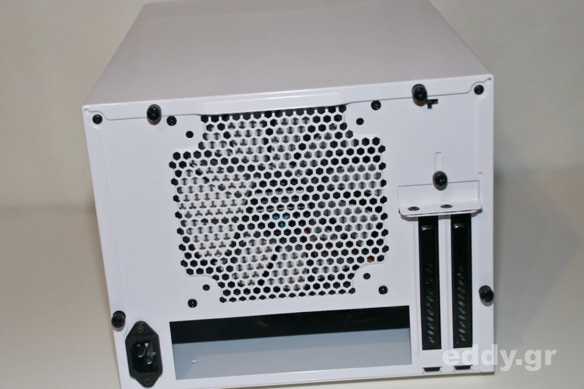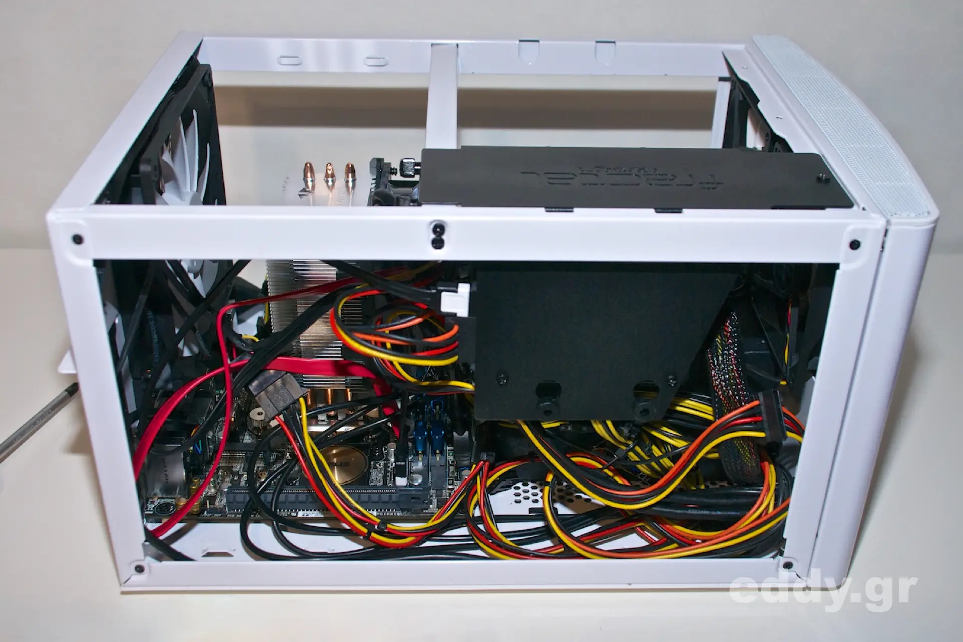 Doch zurück zum Node 304! Aus meiner Sich doch deutlich zu groß für ein Mini-ITX-Chassis ist das mit ca. 90 EUR nicht eben billige Node 304, aber eben doch nicht so riesig wie etwa ein Corsair Graphite 380T. Das Node 304 sieht sehr gut aus, zweifelsohne, wenngleich der obere Plastikabschluss an der Front, welcher in der Ebene als feines Gitter zu sehen ist, nicht ganz zum Rest des Chassis die Farbe hält und in manchem Licht leicht vergilbt aussieht. Doch das ist nicht gravierend und es bleibt dabei: Hübsch ist das Node 304 allemal. Insbsondere in der weißen Variante! Wenn da nicht ein paar Kleinigkeiten wären …