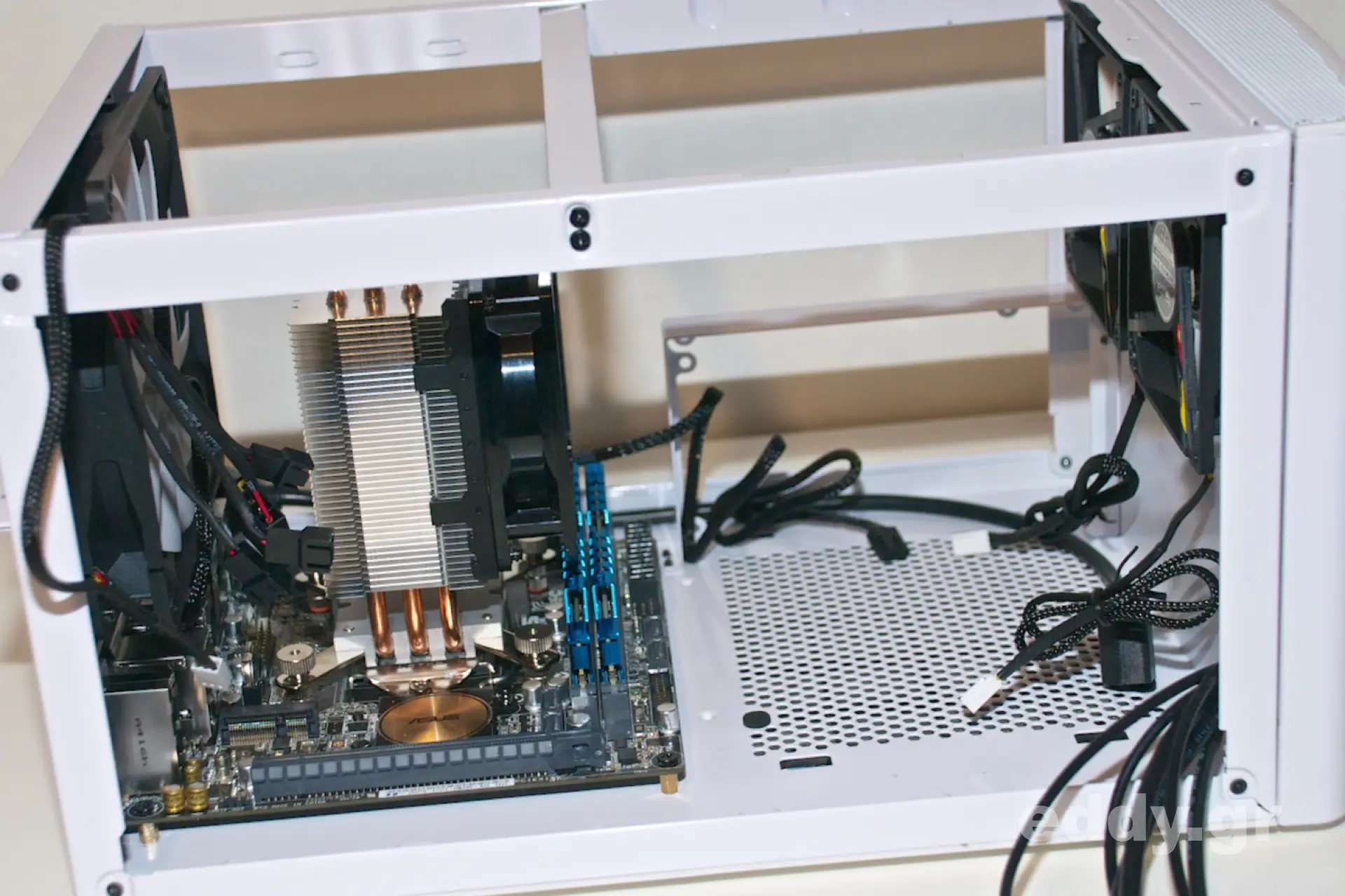 Sicher ist im Node 304 mit den Lüftern oben und hinten viel Sogwirkung da, doch kann der Lufstrom von der Front her aus meiner Sicht nicht den vorderen Teil des Mainboards erreichen. Ich habe den Eindruck, dieses wird schlicht durch die große ATX PSU verursacht, welche der von der Front kommenden kühlen Luft im Wege steht und die RAM-Module auf dem H97I-Plus werden so auch nicht vom besagten Luftstrom erreicht. Folglich werden diese wärmer als nötig. Die Seitenfilter an diesem Gehäuse lassen in Verbindung mit der benannten Sogwirkung sicher auch viel Luft herein, doch ob das Mainboard davon groß profitiert, das ist die Frage. Immerhin nehme ich hier ein LGA1150 Board mit Sockel her, dass ‘zur Not’ und in manchem Anwendungsfall eine leistungsfähige Intel XEON CPU aufnimmt. Ein SFX-Netzteil, kleiner und vielleicht noch weiter vorn platziert, hätte dieses Problem sicher stark abgemildert.