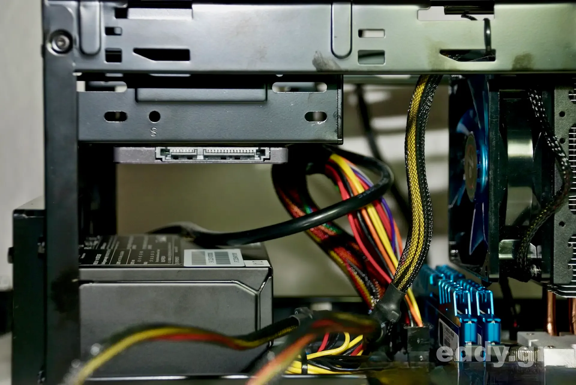 Jetzt wieder mit Antistatik-Armband und mit ASRock Handbuch all die kleinen Käbelchen am Mainboard passend stecken. Bitte keinesfalls die Käbelchen für RESET, POWER LED und POWER BUTTON versehentlich auf die Pins für USB 2.0 stecken!!! Alles schon erlebt! Vom Netzteil den 24-Pin motherboard connector richtig zusammengefügt und wirklich bis zum Abschluss in das Mainboard stecken. Einen der 4-Pin 12V Konnektoren des Netzteils in die dafür vorgesehene Buchse am Mainboard hinten zwischen CPU und Slotblech stecken. Nun einen der drei, am besten den letzten am Kabelstrang, SATA-Konnektoren des Netzteils an der Samsung SSD anstecken. Nun mit einem, aus dem Lieferumfang des Mainboards hergenommenen, SATA-Datenkabel eine Verbindung zwischen SSD und der als SATA0 bezeichneten Schnittstelle am Mainboard herstellen. Jetzt die Kabel etwas drappieren. Nichts soll den Prozessorlüfter im Betrieb berühren können.