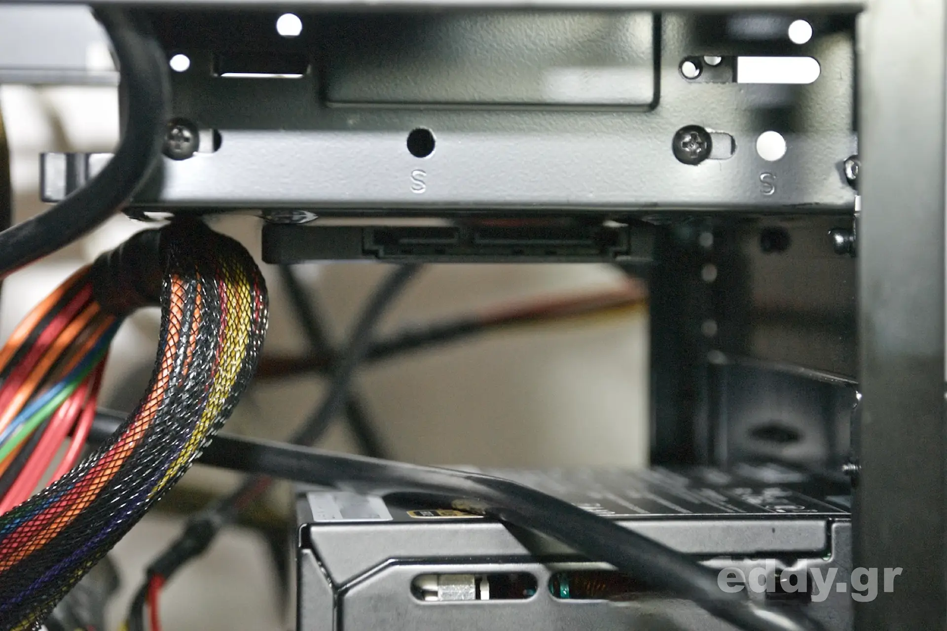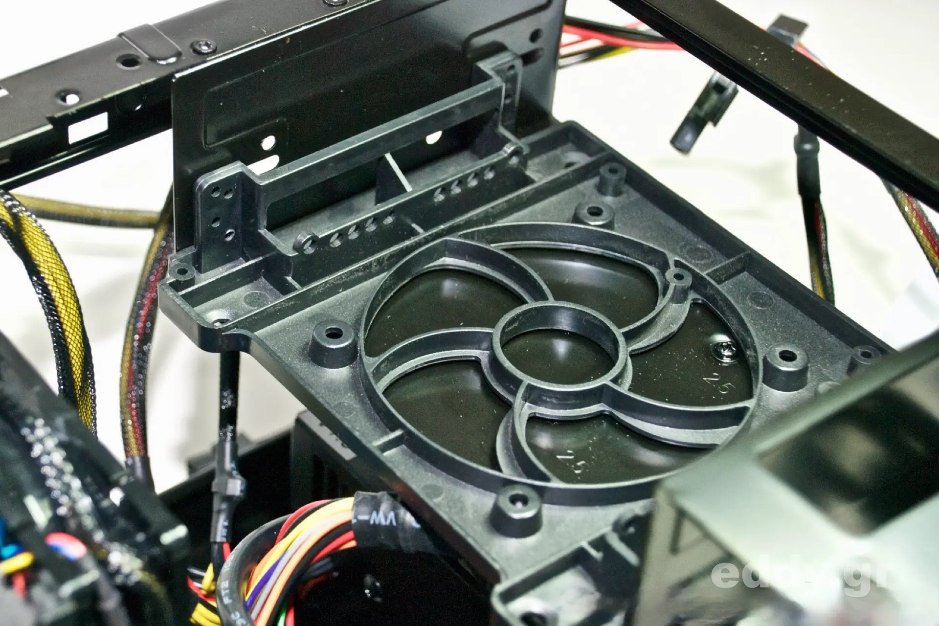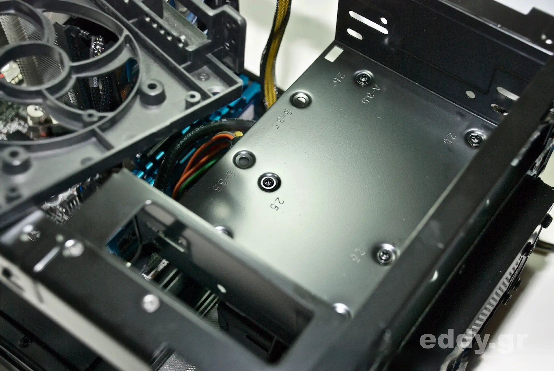 Nun nehmen wir die Samsung SSD, und bugsieren diese von unten und mit dem ‚Bauch‘ nach oben an die Metallfläche mit den vier für 2,5″-Geräte deklarierten Bohrungen. Von oben setzen wir die vier pssenden Schrauben. Die Anschlüsse der SSD sollen dabei übrigens von vorn betrachtet nach links zeigen, nur so klappt es hinterher leicht mit dem SATA-Datenkabel. Man beachte hierzu bitte unsere Foto von der montierten SSD. Abschließend wird wieder der Kunststoffträger im Probellerdesign montiert.