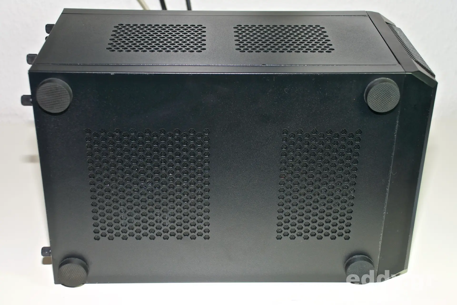 Jetzt vom QB One Bodenblech, Deckel und Seitenteile wieder verschrauben. Gehäuse auf die Seite legen und die vier mitgelieferten und selbstklebenden Gummifüßchen anbringen. Voilà!