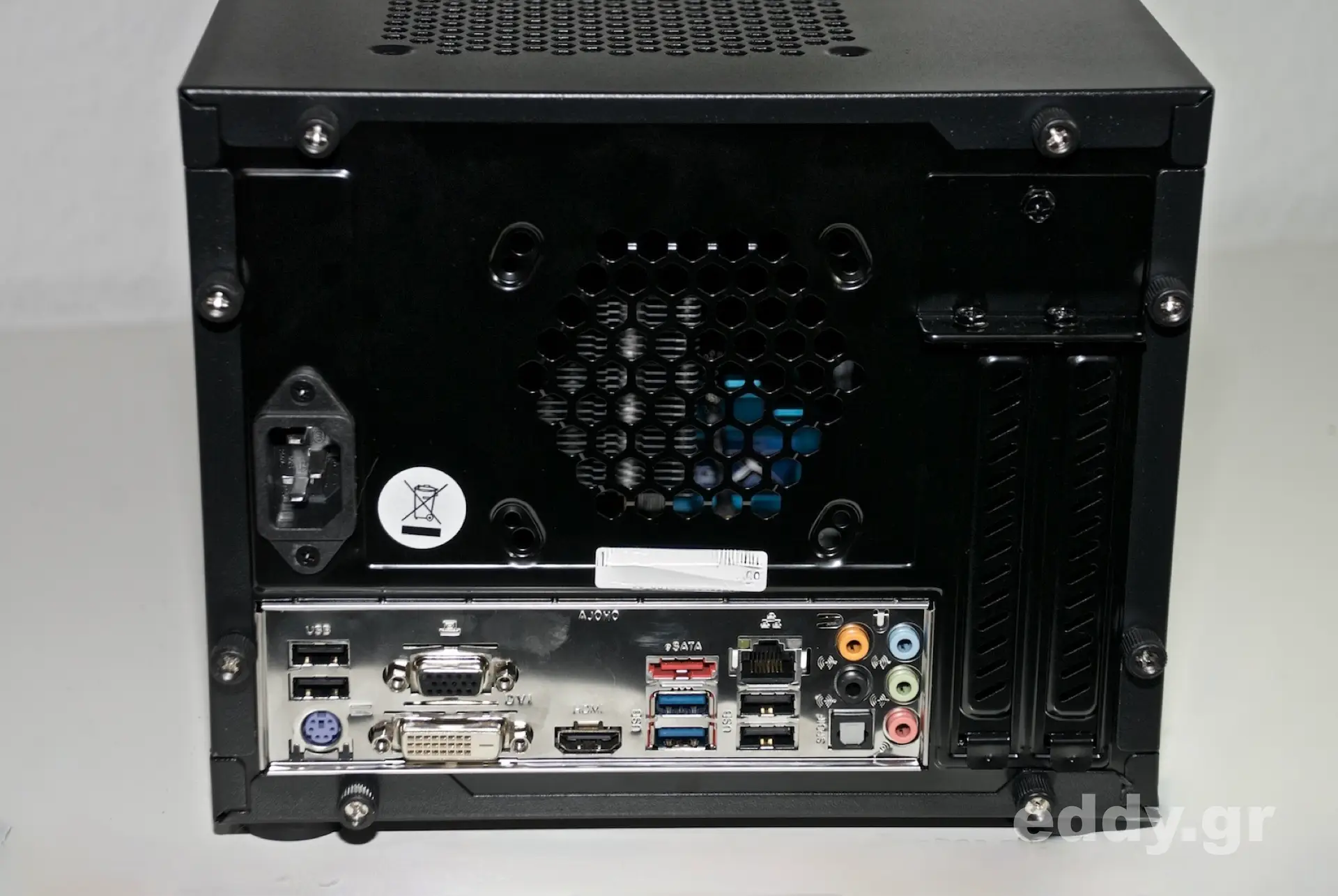 In der Summe kommt die behandelte Konfiguration auf etwa 700 EUR. Als passendes Mainboard nehmen wir das mittlerweile als sehr robust geschätzte ASRock B85M-ITX. Es stellt unserem i5-4590 an der rückwärtigen Anschlussleiste vor allem jeweils eine DVI- und eine HDMI-Schnittstelle zur Verfügung. Zudem ist neben den 4 internen SATA3 Buchsen ebenfalls hinten ein eSATA-Slot verfügbar.