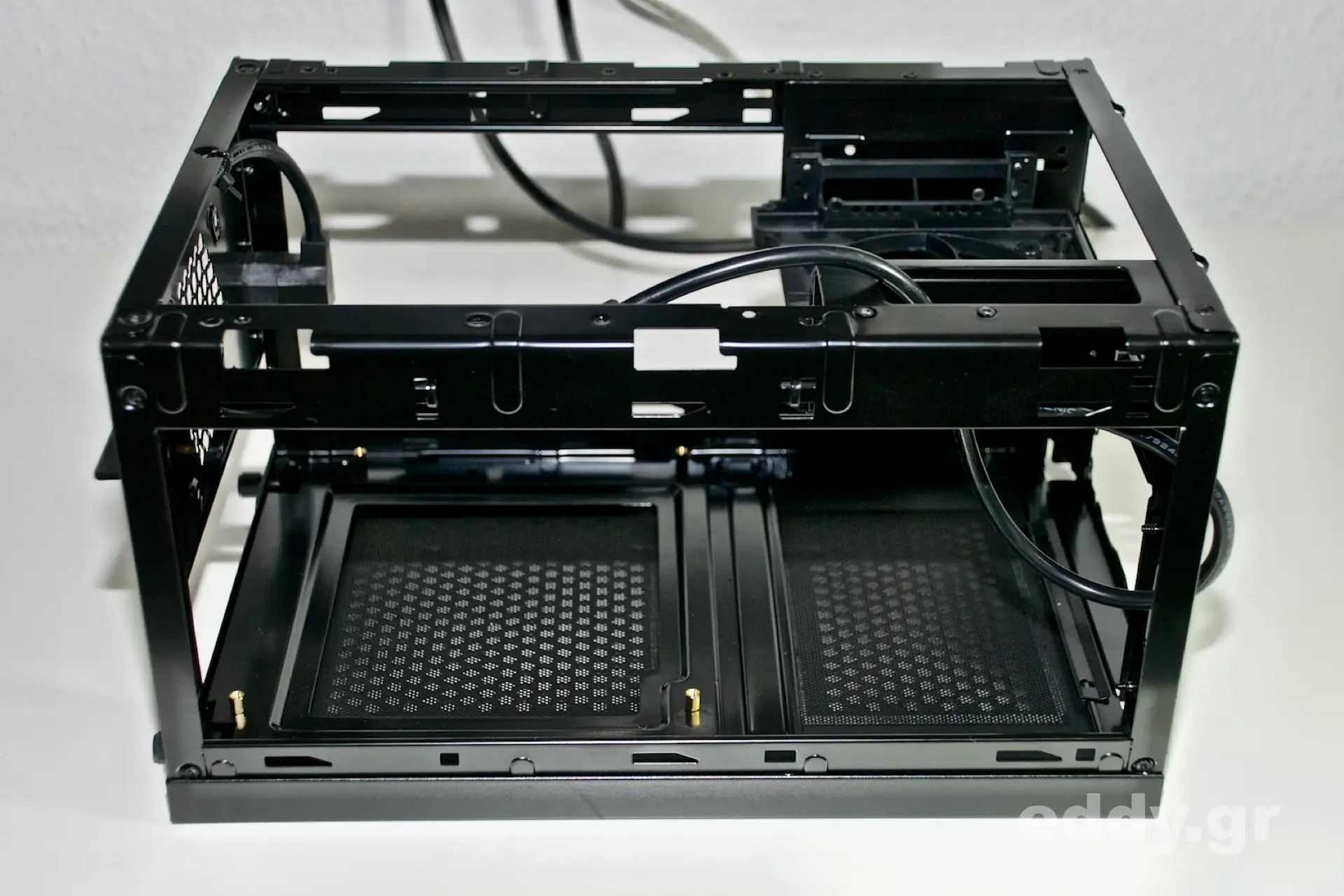 Wir nehmen das Sharkoon QB One und entfernen idealerweise gleich Deckel, Boden und die zwei Seitenwände ganz simpel per Lösen der Rändelschrauben mit den Fingern. In unserem Aufbau werden wir den mitgelieferten Lüfter am Deckel des QB One nicht nutzen, da dieser unserem Kühler im Wegen sein würde und zudem nicht so ganz das gelbe vom Ei zu sein scheint.