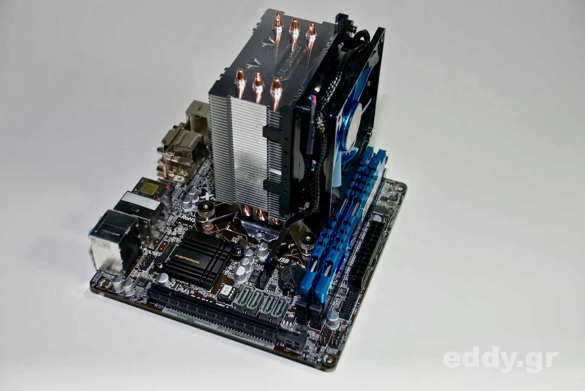 Jetzt sollte man ein Antistatik-Set verwenden: Außerhalb des Gehäuses wird nun am Mainboard die CPU gesteckt und der Enermax Prozessorkühler mittels der diesem Produkt beiliegenden Anleitung montiert. Ich empfehle als Wärmeleitpaste in jedem Fall das in der Liste genannte Arctic MX-2. Das Käbelchen des Lüfters wird passend am Mainboard gesteckt und die beiden Speichermodule kommen jetzt ebenfalls in ihre Slots.