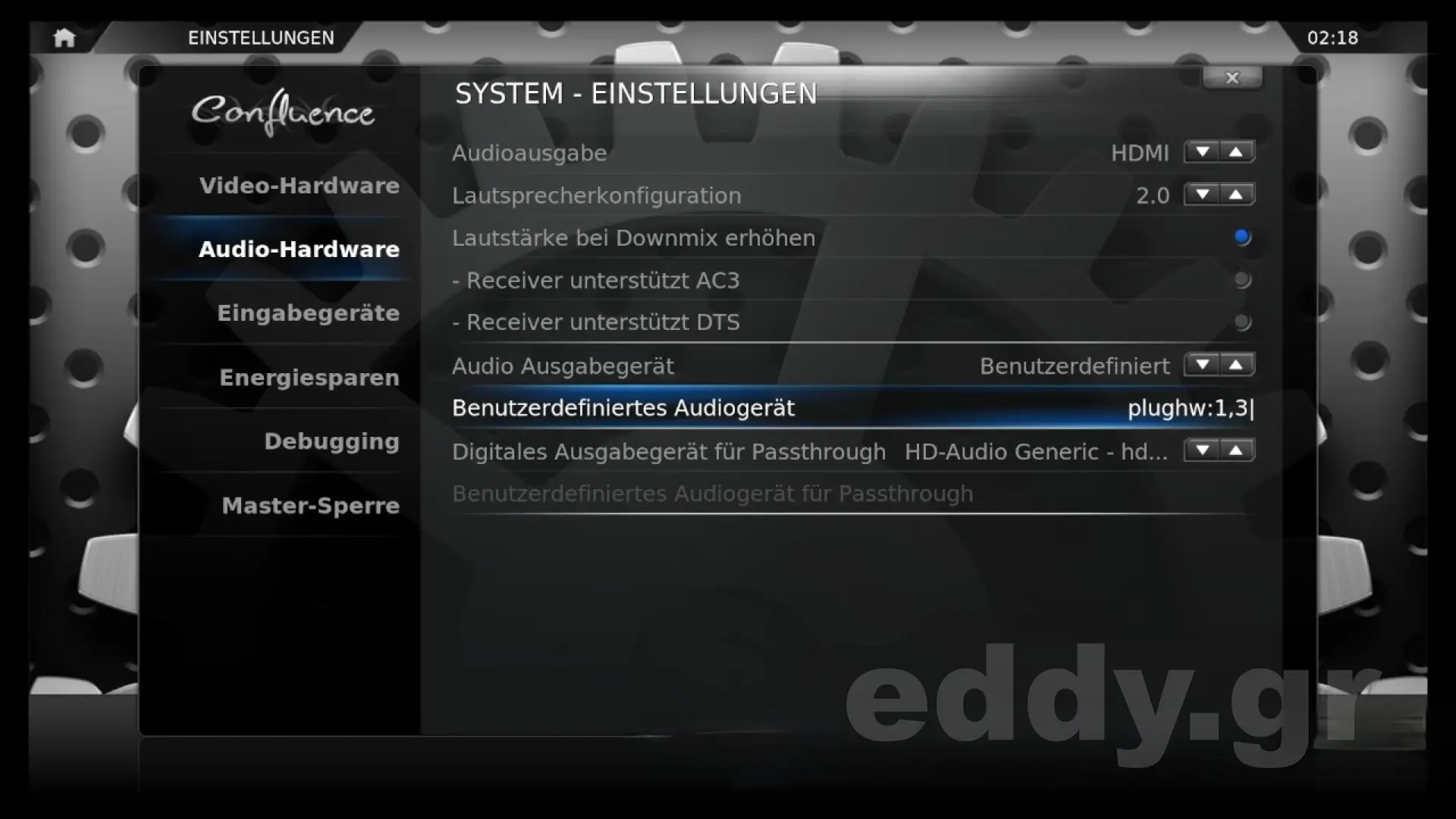 Den einzigen Fallstrick will ich Euch nicht vorenthalten: Der Ton über HDMI wird mit einer gewissen Wahrscheinlichkeit fehlen. Die Ursache liegt im Linux-Gedöns unterhalb XBMC. ALSA und so. Die Behebung schaut so aus, dass man im Hauptmenü des fertig installierten OpenELEC in System>Einstellungen>System>Audio-Hardware unter ‘Audio Ausgabegerät’ den Wert Benutzerdefiniert wählt, sodann unter ‘Benutzerdefiniertes Audiogerät’ den Wert plughw:1,3 einträgt.
