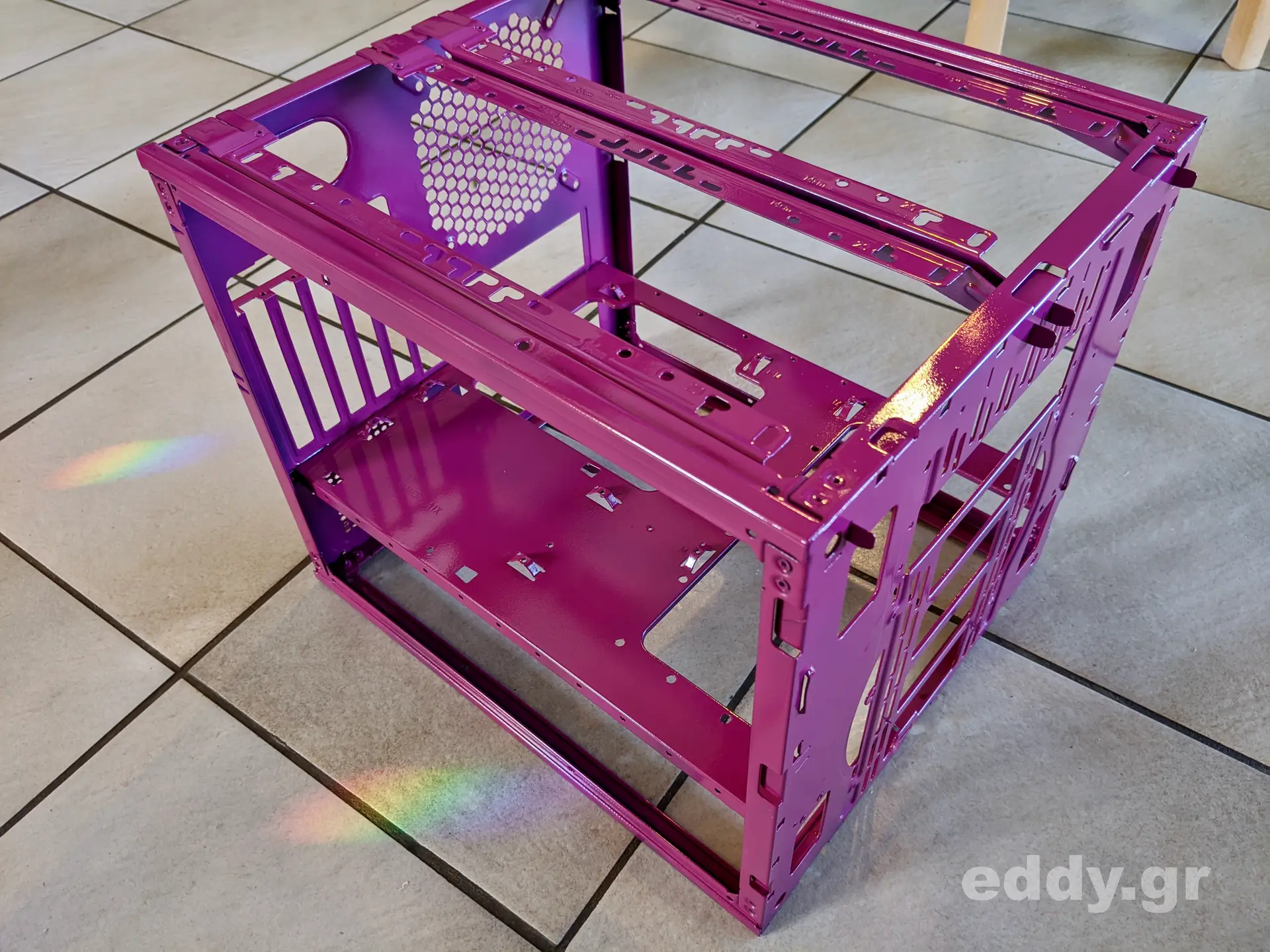 Oben lässt es sich fix abnehmen, unten ebenso, die Seiten sowieso. Du willst also schnell mal von oben an die CPU oder eine PCI-E Karte stecken, dann no problemo. Die magnetischen Staubmatten sind dieser erfüllungsvollen und um Jahrzehnte verspäteten Einfälle. Die Front des Thermaltake Gehäuse ist leider so ein Kunststoffspritzguss-Teil. Die Plastikbolzen wollen generell brechen. Früher oder später. Meine Erfahrung. Wer Kunststoff kennt, der will Metall. 🙂 Sei es drum, fürs Geld ein prima Case. Im hier behandelten Szenario glänzt das Blechle mit seiner guten Lackierbarkeit. Und seien wir ehrlich: Verkehrspurpur ist für solch ein schönes Setup unerlässlich.