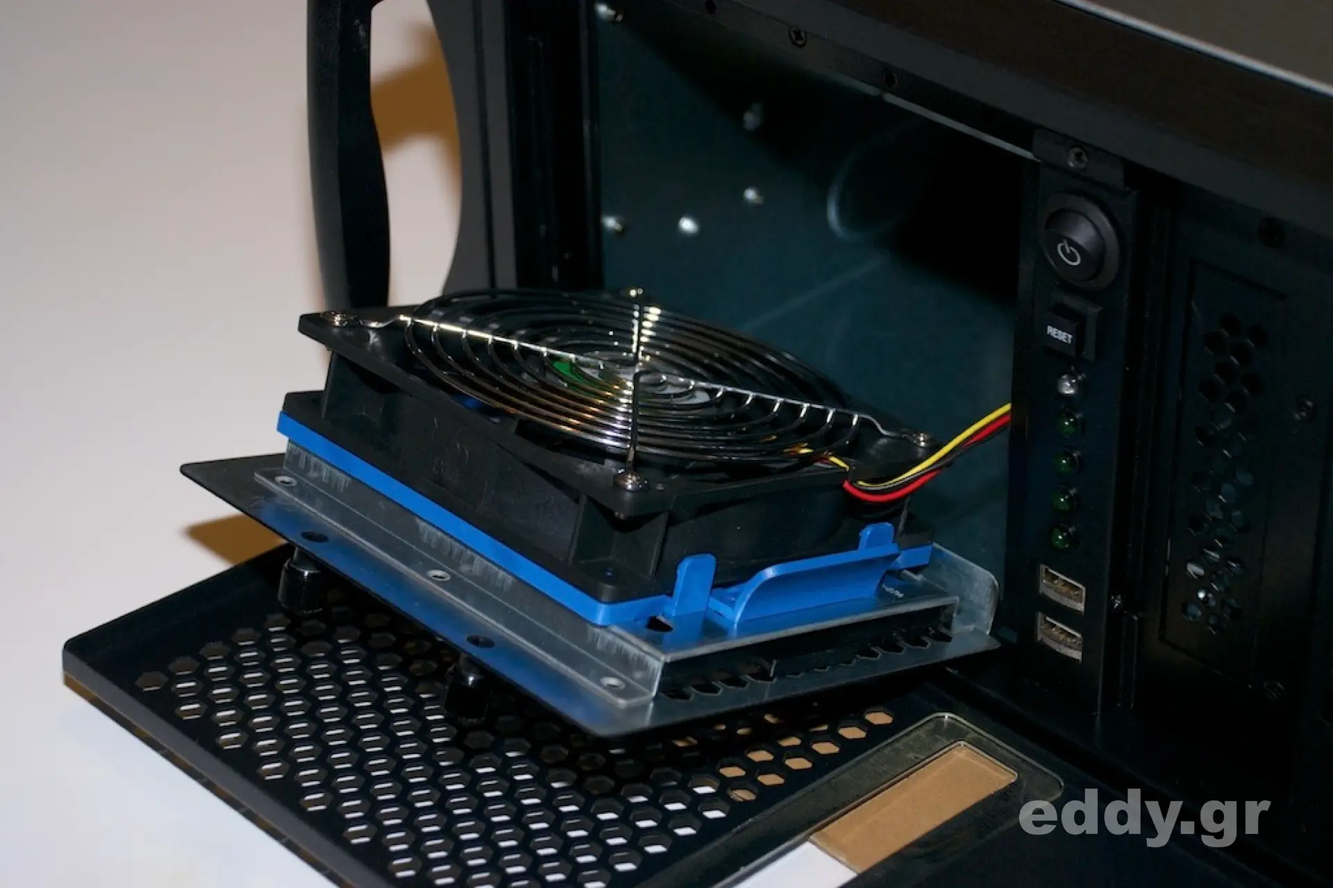 Ein weiteres Indiz der Verarbeitungsgüte zeigt sich einem, indem man ganz simpel links unterhalb der Frontblende die zwei schwarzen Rändelchrauben löst und den mit einem Luftfilter versehenen 12cm-Frontlüfter vorklappt und bei Bedarf stressfrei entnimmt. Das ist schlicht perfekt gelöst.