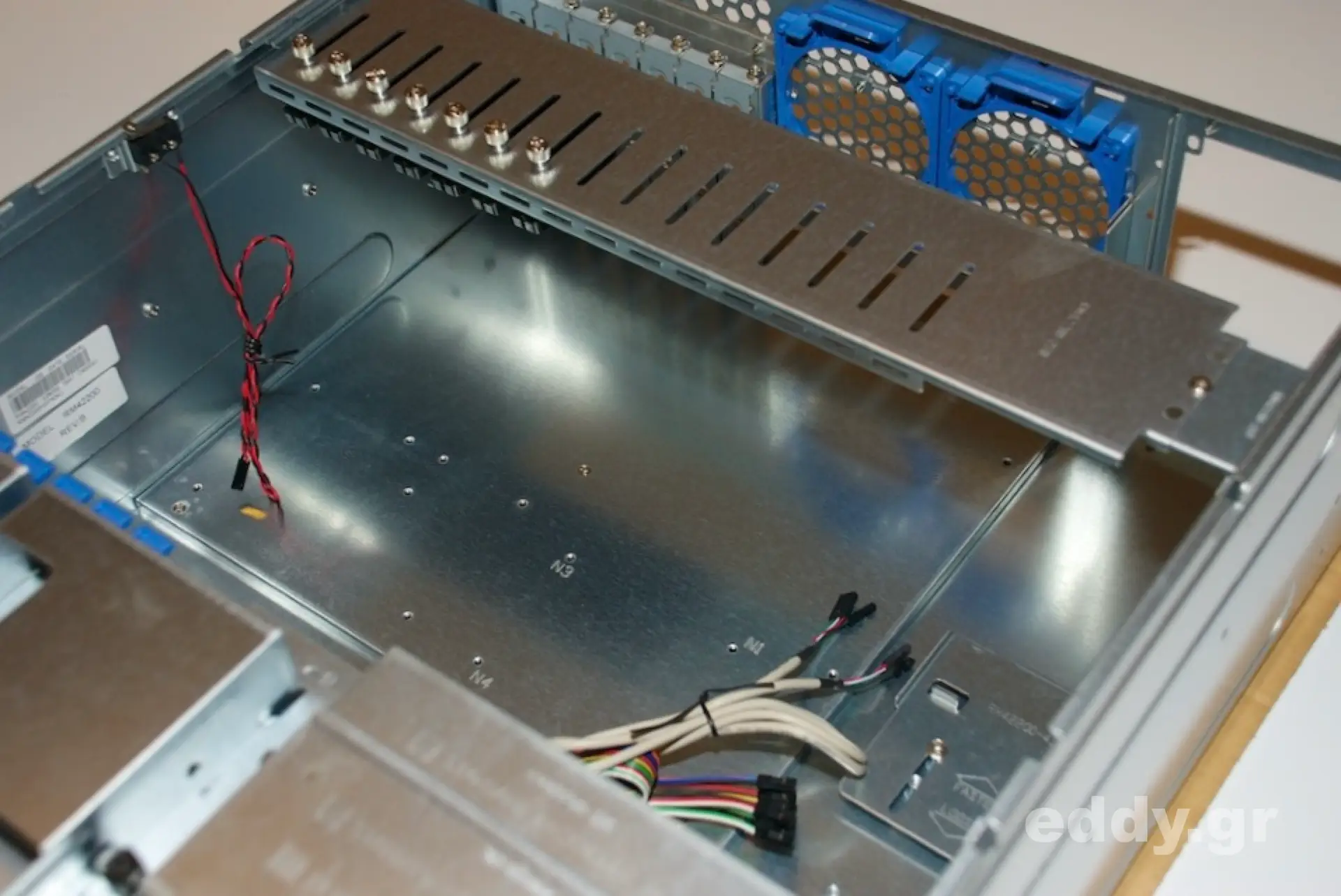 Das Chenbro bietet serienmäßig Platz für 1 DVD-Laufwerk und 7 Festplatten, oder natürlich für 8 Festplatten (bzw. SSDs). Zwei 3,5″ Laufwerke können in Mettalhaltern oberhalb des vorderen linken 12cm-Lüfters montiert werden. Im Bereich zwischen den beiden großen Metallkästen befindet sich der Metallrahmen für zwei 3,5″ Laufwerke, wovon eines von außen zugänglich wäre (wie hießen die Dinger früher doch gleich … Disketten?). Dieser kleine Rahmen lässt sich simpel mit einer Rändelschraube lösen und entnehmen. Zwei Festplatten oder SSDs sind geschwind angebracht und wieder im Gehäuse positioniert. Im linken Kasten (von hinten betrachtet) kann direkt am Boden dieses Metallrahmens eine weitere 3,5″-Gerätschaft montiert werden und darüber drei große 5,25″ Laufwerke oder entsprechend kleinere Laufwerke mit Abstandshaltern.
