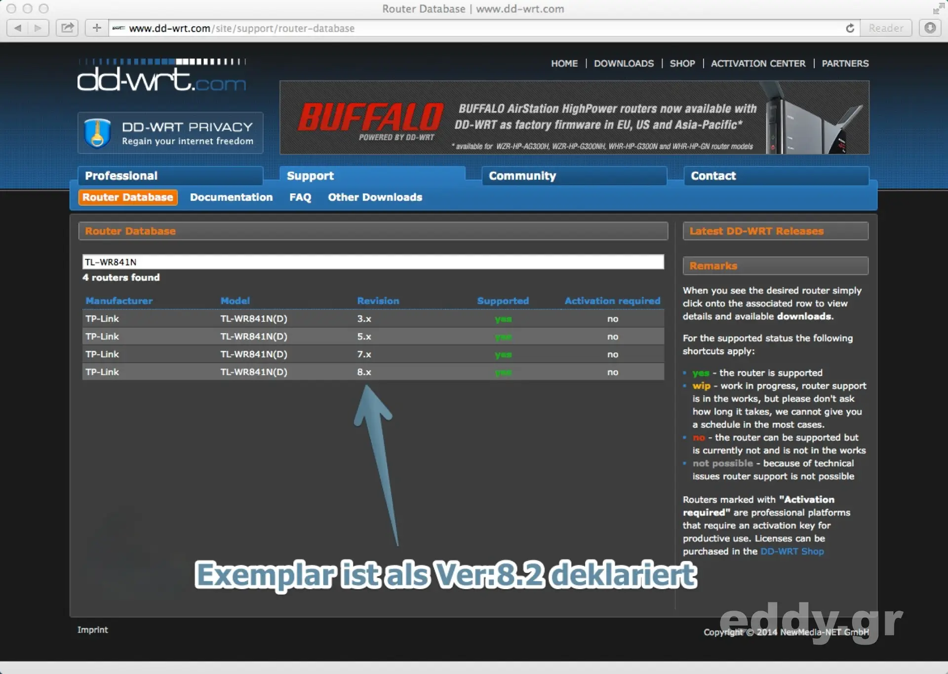Der graue Geräteaufkleber auf der Unterseite weist unser Exemplar als v8.2 aus. Für unser Gerätemodell ist die Vorgehensweise also, innerhalb des Suchfelds der DD-WRT Router Database den Suchbegriff TL-WR841N einzugeben. Das unterste Ergebnis mit der Zeile Revision 8.x ist für das uns vorliegende Modell richtig. Wir klicken die Zeile und dann ist (für unser v8.2 Exemplar) das hier wichtig: Requires tl-wr841ndv8 build. Entscheidend für uns ist der String tl-wr841ndv8.Wir klicken ‘other Downloads’ , dort den Link zum 2014 Ordner und hier den zum Testzeitpunkt einzig vorhanden Link 01-10-2014-r23320-fix.Diese Schritt-für-Schritt-Sätze mögen erfahrene Tony-Montana-Hacker mit 2-Tasten-Binärtastatur etwas befremden. Laut den E-Mail, die hier so eingehen, schätzen weniger erfahrene Nutzer diese feiner granulierten Beschreibungen umso mehr. Habt darum bitte etwas Nachsicht …