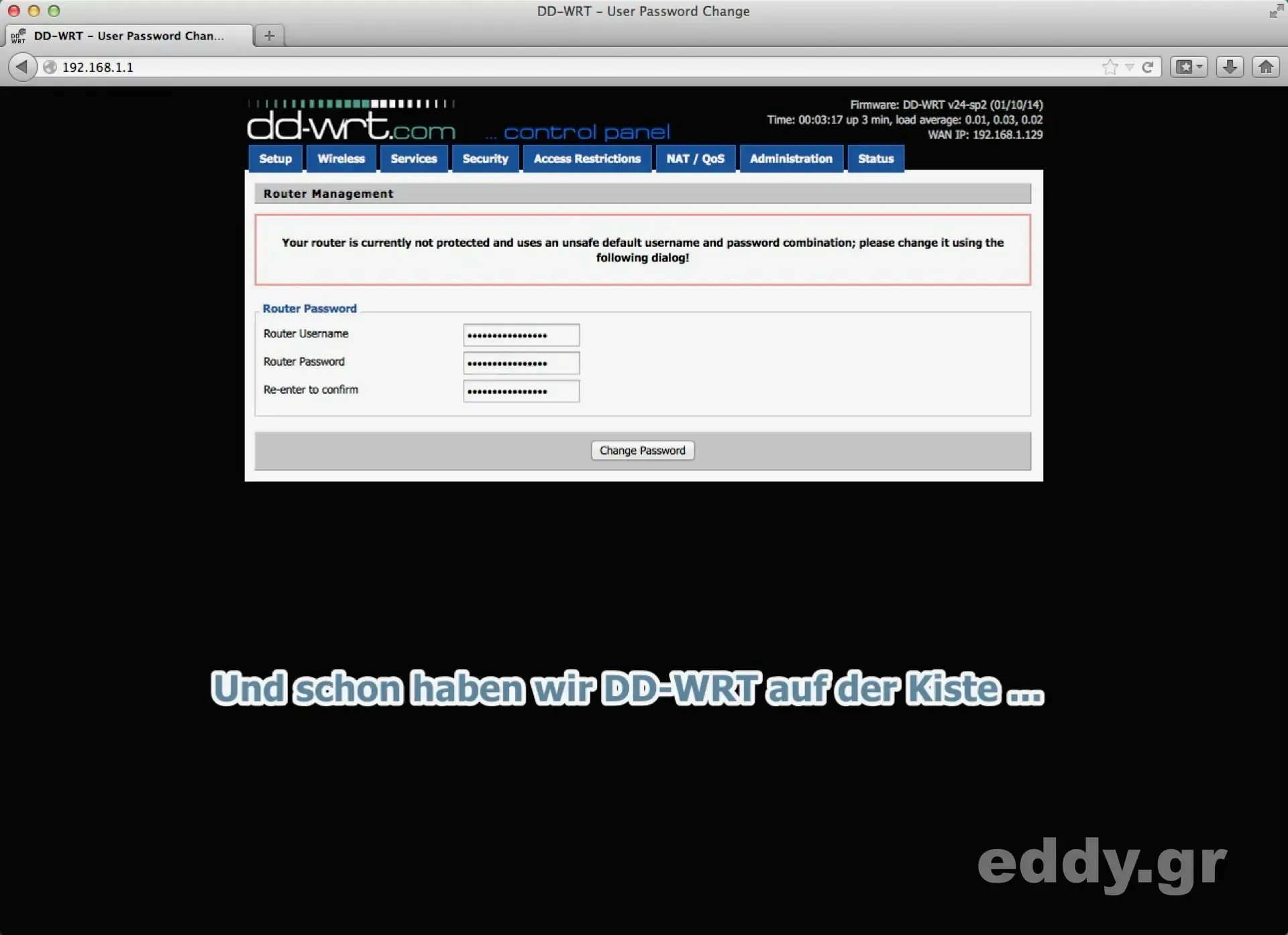 Macht nix. Wir ermitteln also mit dem schicken LanScan Pro die gegenwärtige Adresse des TL-WR841ND im lokalen Netz und kommen so endlich ins Setup des schmucken TP-LINK Routers. Man kann natürlich auch in seiner Firewall, seinem Haupt-Router, was-auch-immer …, nachschauen, welche IP der neue weiße TL-WR841ND gerade innehat. Es wird die Vergabe eines neuen Passworts gefordert und wir sind drin, in der TP-LINK Admin-Oberfläche. Allerdings nur für kurz, denn wir wollen das Betriebssystem ersetzen durch unser liebgewonnenes DD-WRT.