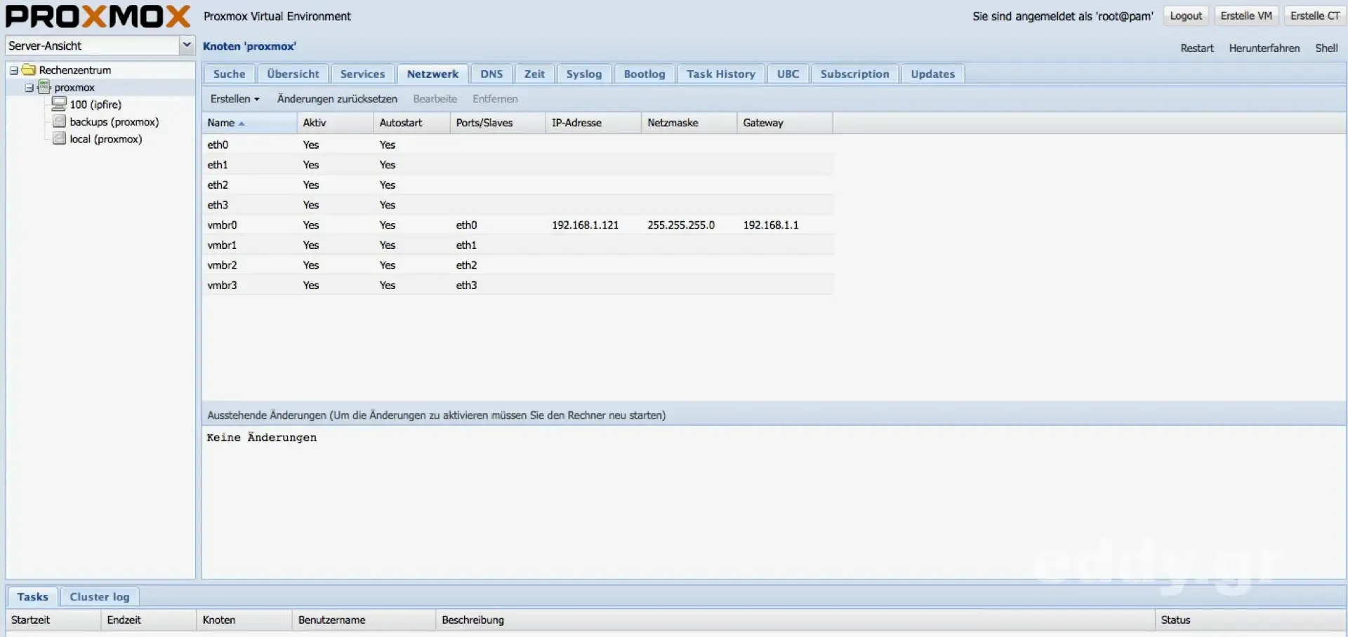 #deb https://enterprise.proxmox.com/debian wheezy pve-enterpriseIn unserem spezifischen Beispiel haben an dieser Stelle noch kein Internet und ein apt-get würde jetzt ins Leere greifen. Das alles geht erst nach der Einrichtung der Firewall. Jetzt loggen wir uns von einem beliebigen Rechner innerhalb der grünen Zone in unsere Proxmox Installation per Browser ein. Das geschieht unter der Adresse https://192.168.1.121:8006. Wir wählen im Anmeldefenster die deutsche Sprache aus und geben root und das Passwort ein. Schnell erstellen wir noch im Proxmox (Knoten > Netzwerk > Erstellen > Bridge) passend zu unserem Supermicro Board virtual Bridges (vmbr). Viermal für die vier physischen Ethernet Ports am Serverboard. Hiernach ist ein Restart sinnvoll. So sieht es dann aus: