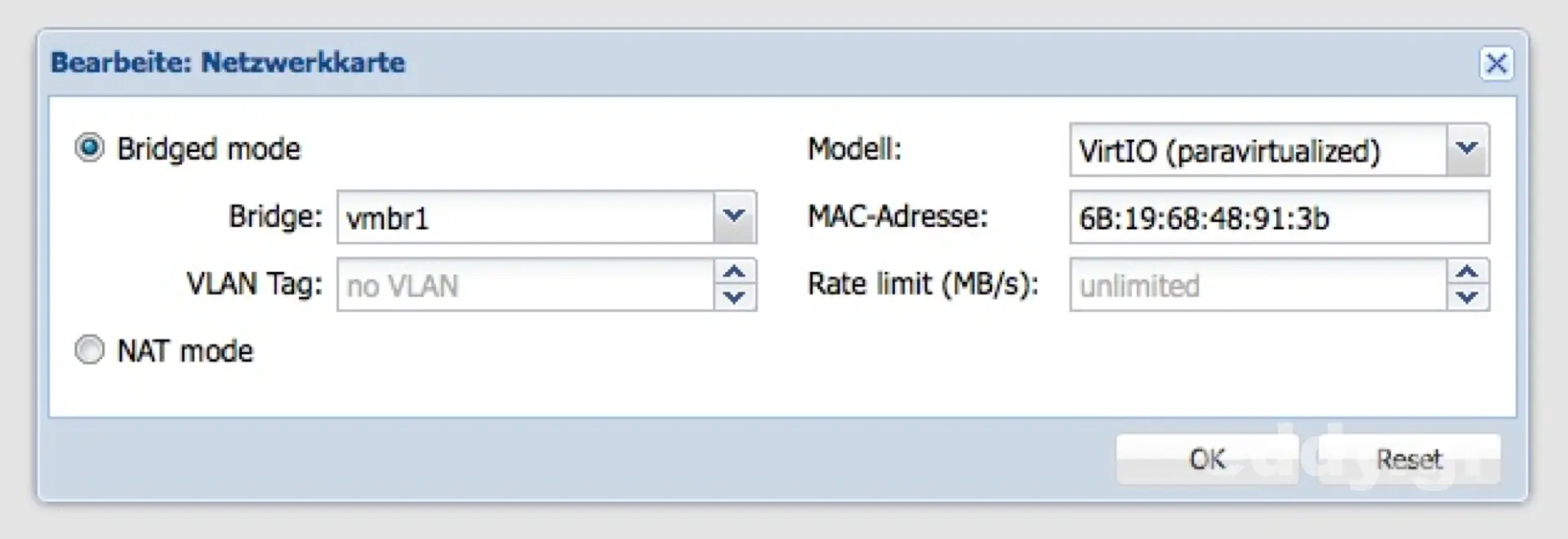 Im Karteireiter ‘Netzwerk’ ruhig erstmal Keine Netzwerkkarte auswählen und dann Vorwärts und Abschließen klicken. Links ist die neue VM namens 100 ‘ipfire’ dann zu sehen. Der verpassen wir noch schnell vor dem ersten Start die virtuellen Netzwerkkarten. VM klicken und rechts im Karteireiter ‘Hardware’ und mittels Hinzufügen Netzwerkkarte wählen. Das werden wir in unserem Beispiel dreimal machen für die Anbindung an vmbr1, vmbr2 und vmbr3. Man orientiere sich an meinem lustigen Schaubild weiter oben. Im folgenden Bild das Beispiel für grün bzw. ETH1 bzw. vmbr1: