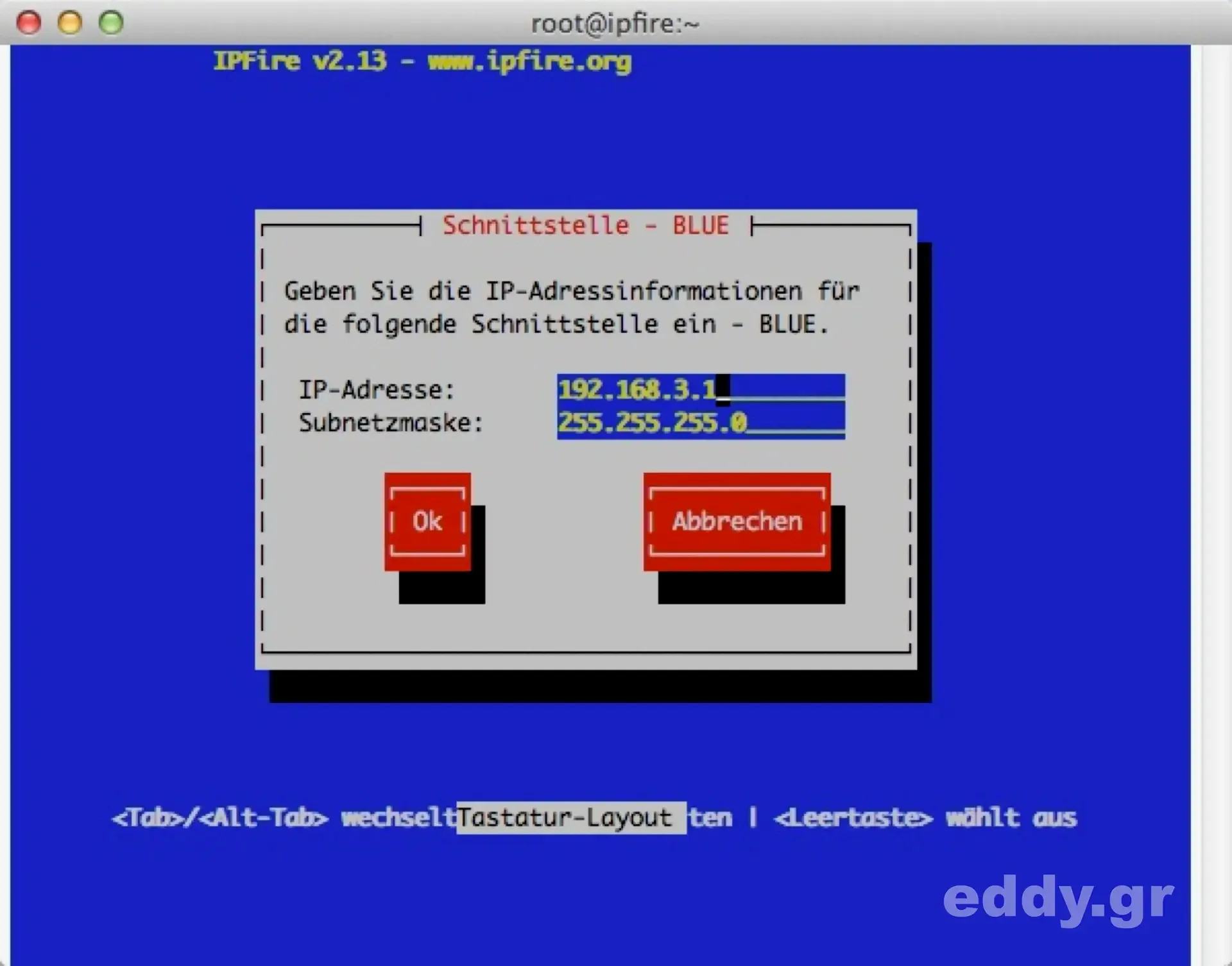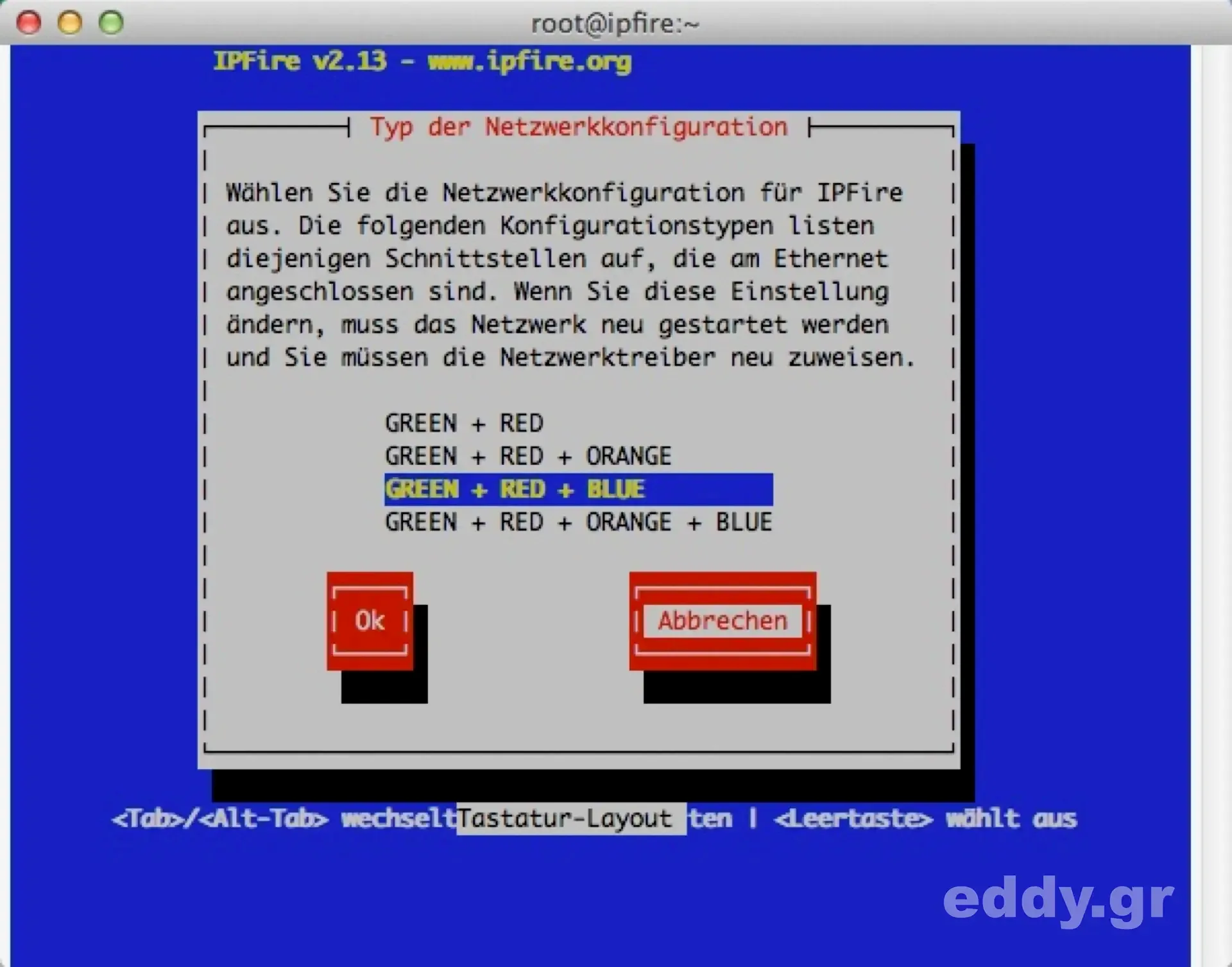 Meine kleine Anleitung soll sich, wie im Vorfeld geschildert, am Supermicro X9SCI-LN4F orientieren. Damit wir hinterher mit der Zuordnung von Mac-Adressen und physischen Ethernet Ports nicht ins rudern kommen, machen wir auf einem Zettel oder im Wiki (gehört ebenfalls auf jeden Heimserver) entsprechende Notizen. Spätestens dann, wenn die MAC-Adressen der VM-eigenen virtuellen Netzwerkkarten hinzukommen, wird man es danken. In meinem Beispiel beschränken wir uns auf die Einrichtung dreier Zonen (rot auf ETH1, grün auf ETH2, blau auf ETH3) und lassen die Demilitarisierte Zone erstmal außen vor. Gegenpart in der roten Zone ist wie gehabt das Speedport Modem, welches für seine anderen gelbfarbigen Ethernet Ports weiter das eigene DHCP (hier 192.168.8.x) laufen hat. Im konkreten Fall dient das einem separaten Netzwerk für das Telekom IPTV namens ‘Entertain’, welches wir explizit nicht durch unser IPFire routen wollen. Intern ab der ‘roten Buchse’ haben wir mit dem Speedport Router ohnehin nichts mehr zu tun.