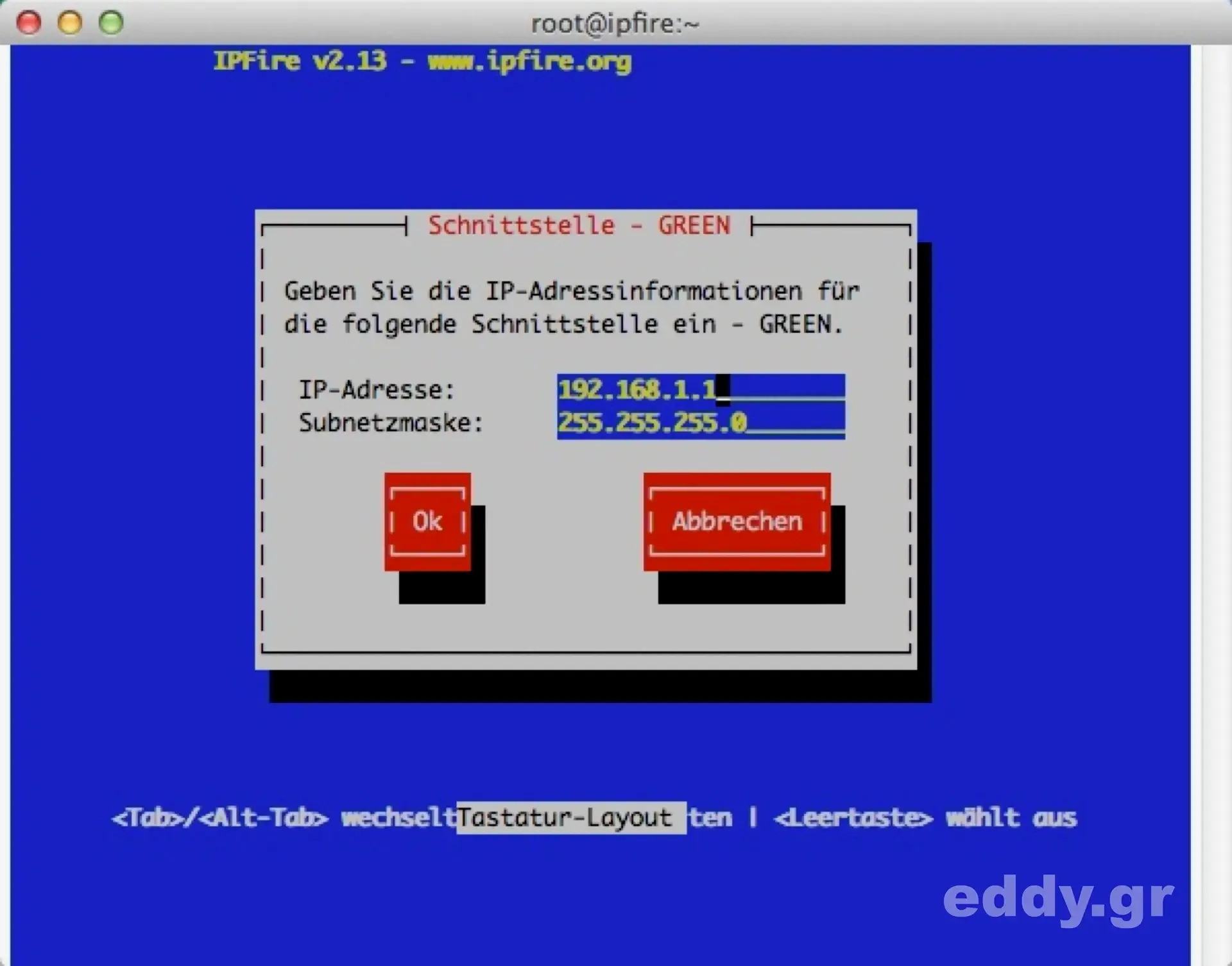 Die VM mit IPFire steht soweit. Jetzt starten wir die Virtuelle Maschine links mit Rechtsklick auf 100 (ipfire) und Klick auf ‘Start’ bzw. den ‘Play’ Button und im selben Kontextmenü klicken wir uns mit dem untersten Punkt ‘Konsole’ ein Terminal im Browser, wo wir nun schon in die IPFire Installation reingucken und diese anpassen. Macht man hier etwas falsch, so lässt sich hinterher jederzeit das Setup von IPFire innerhalb der Konsole neu durchspielen (in unserem Beispiel mittels ssh [email protected] und dem Kommando setup. 192.168.1.1 deshalb, weil wir es in der laufenden IPFire Konfiguration für grün so vorsehen). Nach außen bzw. rot bekommt unser Beispiel, die feste IP 192.168.8.150 zum Speedport W 921V hin.