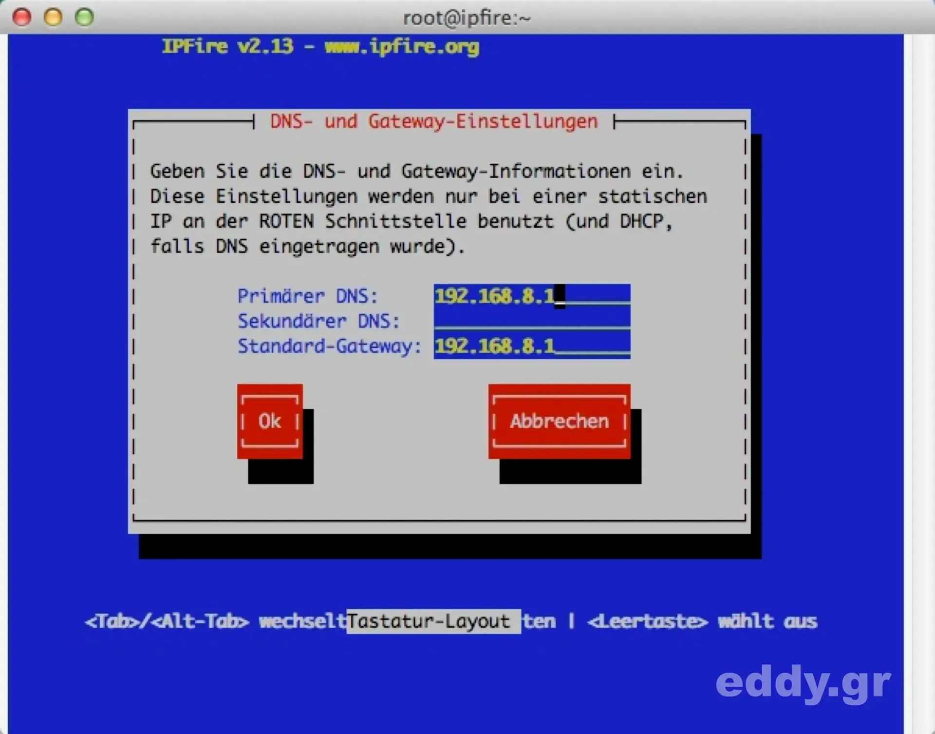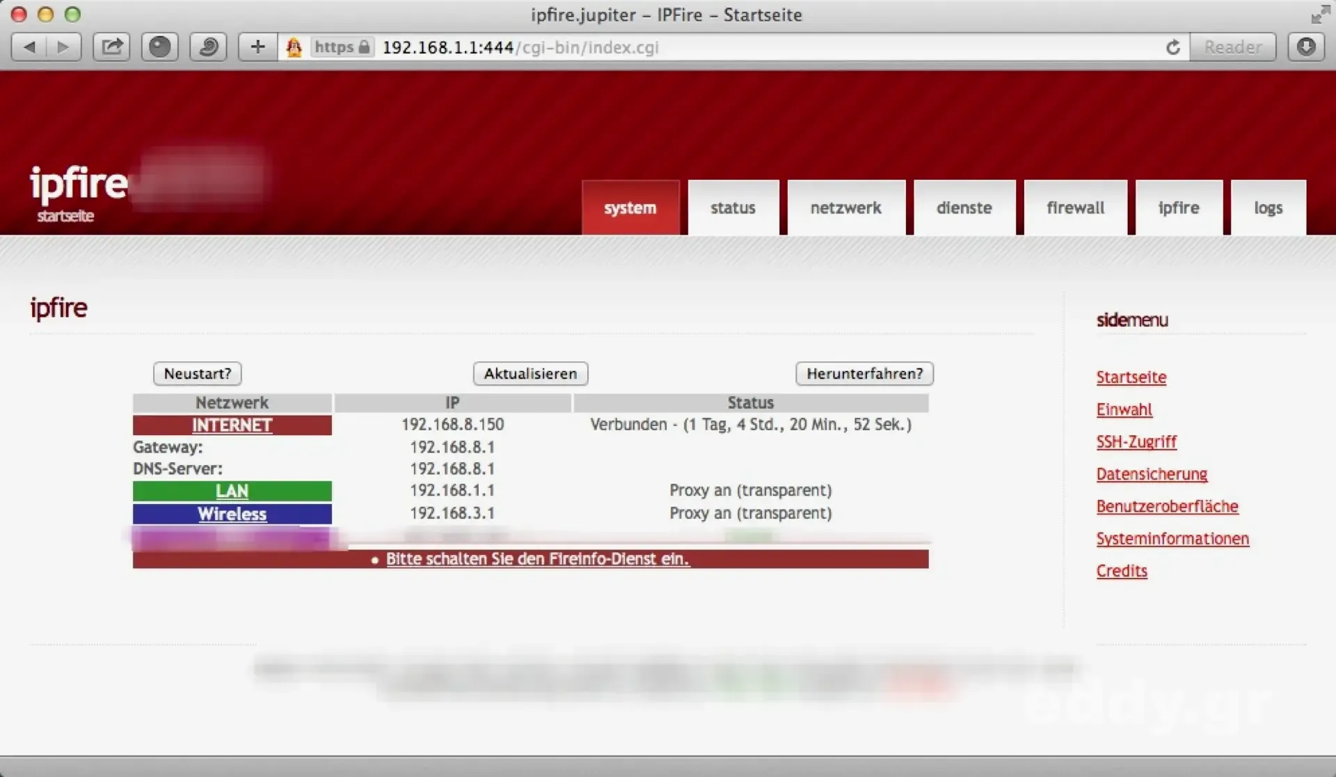 Wenn alles glatt gelaufen ist, dann läuft die Firewall jetzt schon wunderprächtig. Wir rufen im Browser unser IPFire unter https://192.168.1.1:444 auf und klicken uns die Feinheiten. Die groben Dinge wurden ja schon im Konsolen-Setup erledigt.
